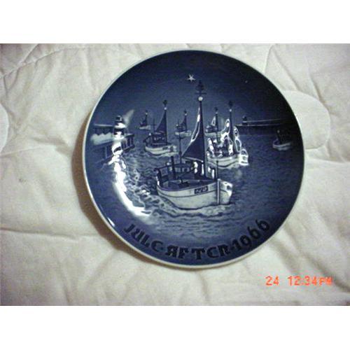 This is grande porcelain from Copenhagen named "Jule After 1966", displaying fun-looking sailboats on a background of highly collectible cobalt blue. It is in excellent condition, no chips and/or cracks. The reverse says "Hjam til Jul", showing the initials "AA".
