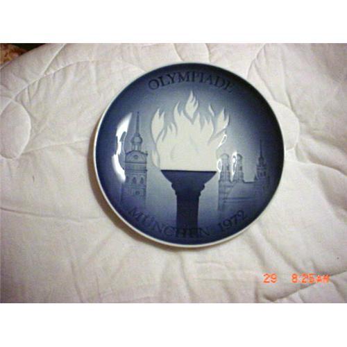This is grande porcelain from Copenhagen named "Olympiade, Munchen 1972", displaying the olympic torch. It is in excellent condition, no chips and/or cracks. On the reverse side is the B&G id, nos. 8000/9472, Olympic Games, Munich 1972, First Issue, and the painter's signature.
