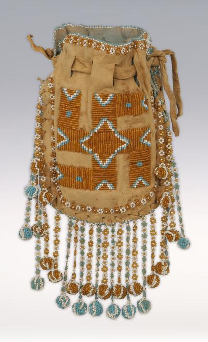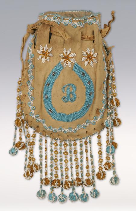 Plateau Beaded Bag. 7" x 5 1/2". Pictorial designs. C. 1910-20. Condition Report: Hide is slightly discolored and stained from age and use but generally in excellent condition.