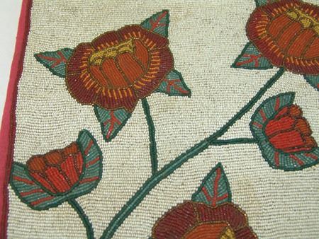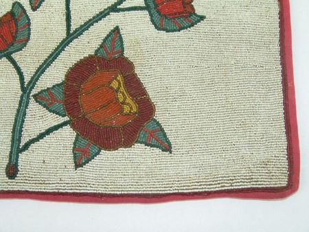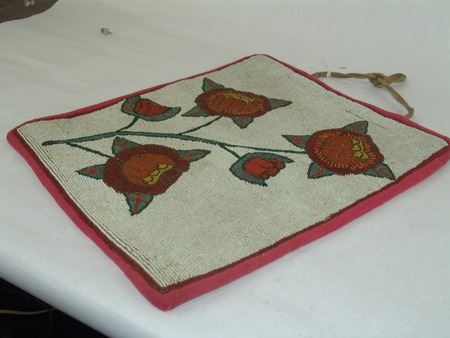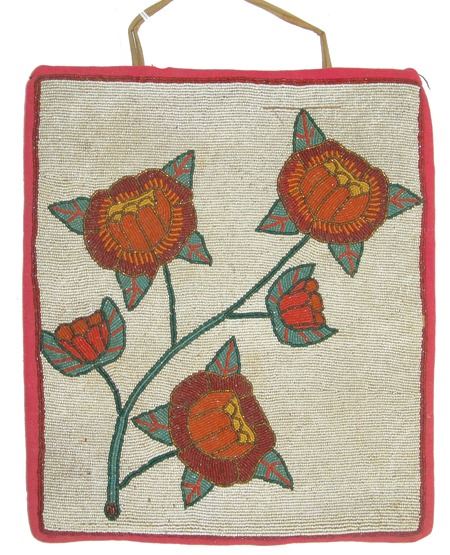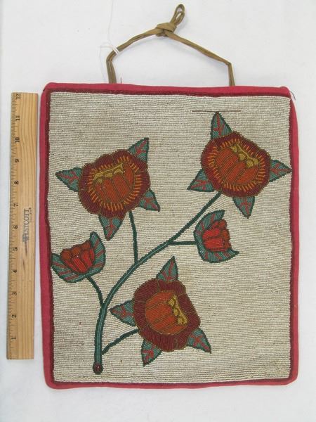 Ca. 1920s, Wonderful larger-sized pictorial flat bag, the fully beaded front panel with unusual florals against a white field, and with antique cloth lining. Very good condition. 14-1/4" x 12-1/4"