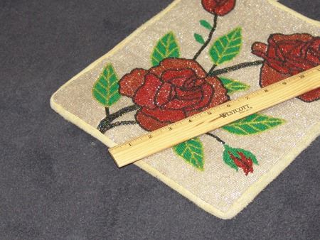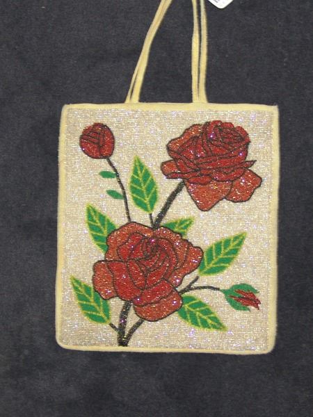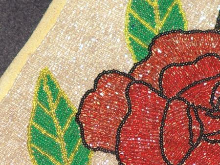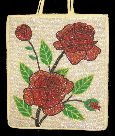 Early/Mid 1900s, Classic rectangular flat bag trimmed in buckskin, the front fully beaded with red roses on a pearl white field. Very good condition. 12-3/4" x 11-1/4"