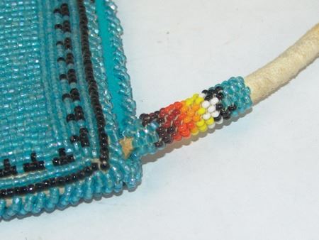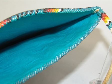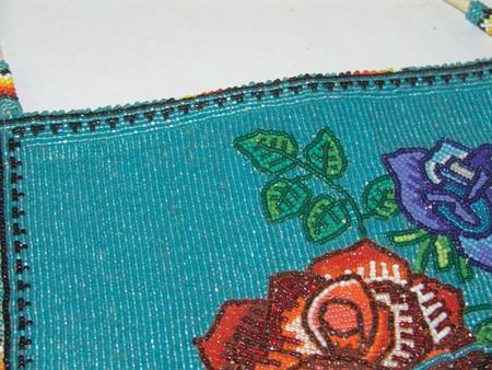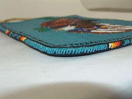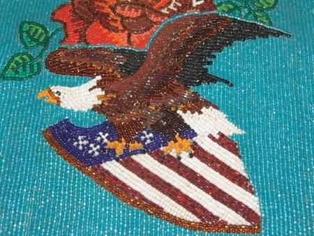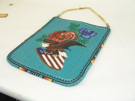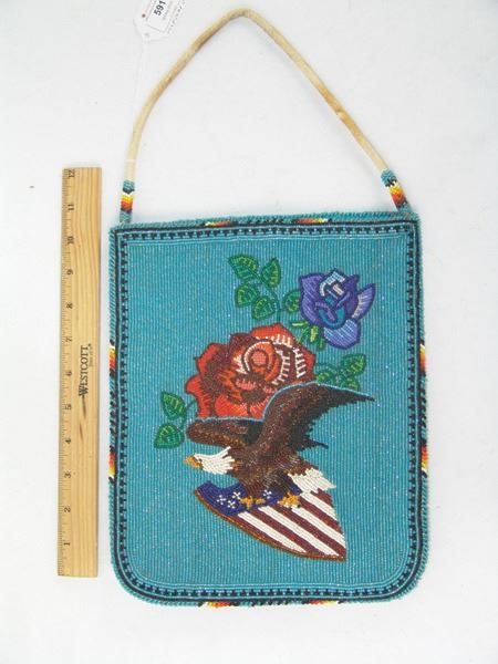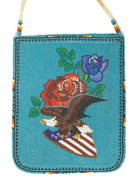 Ca. 1970s, Beautiful flat beaded bag with corduroy back and beaded front with roses and a bald eagle carrying American flag crest. Very good condition. 11-1/4" x 9-1/4"
