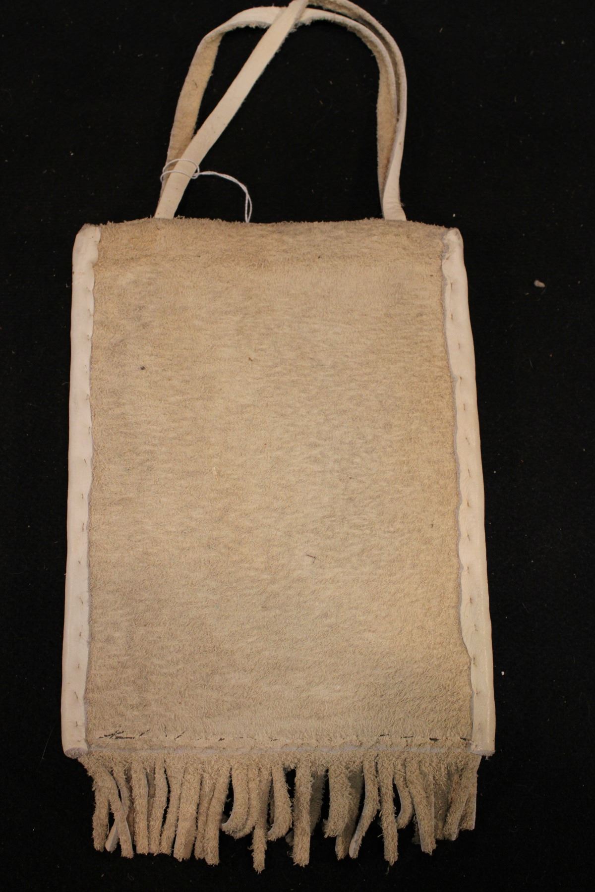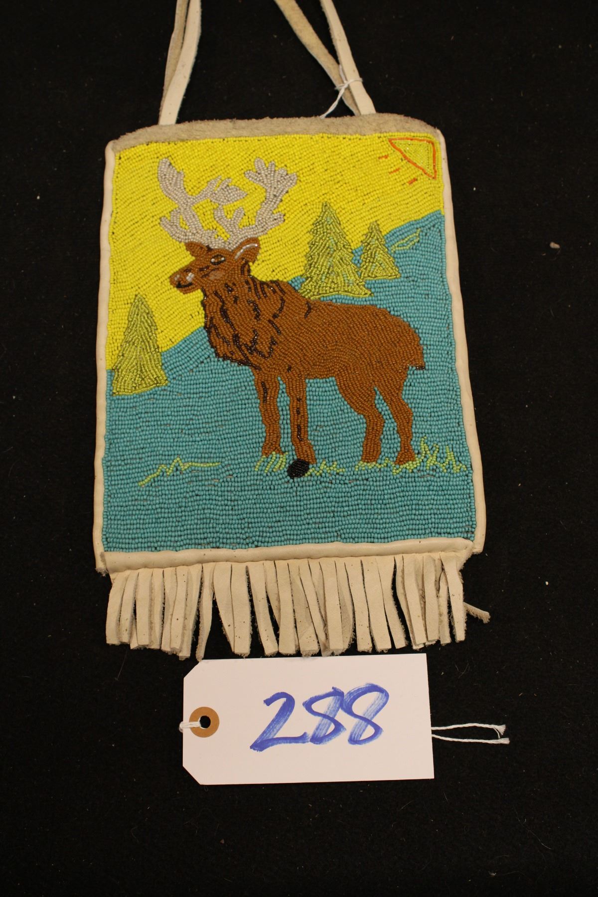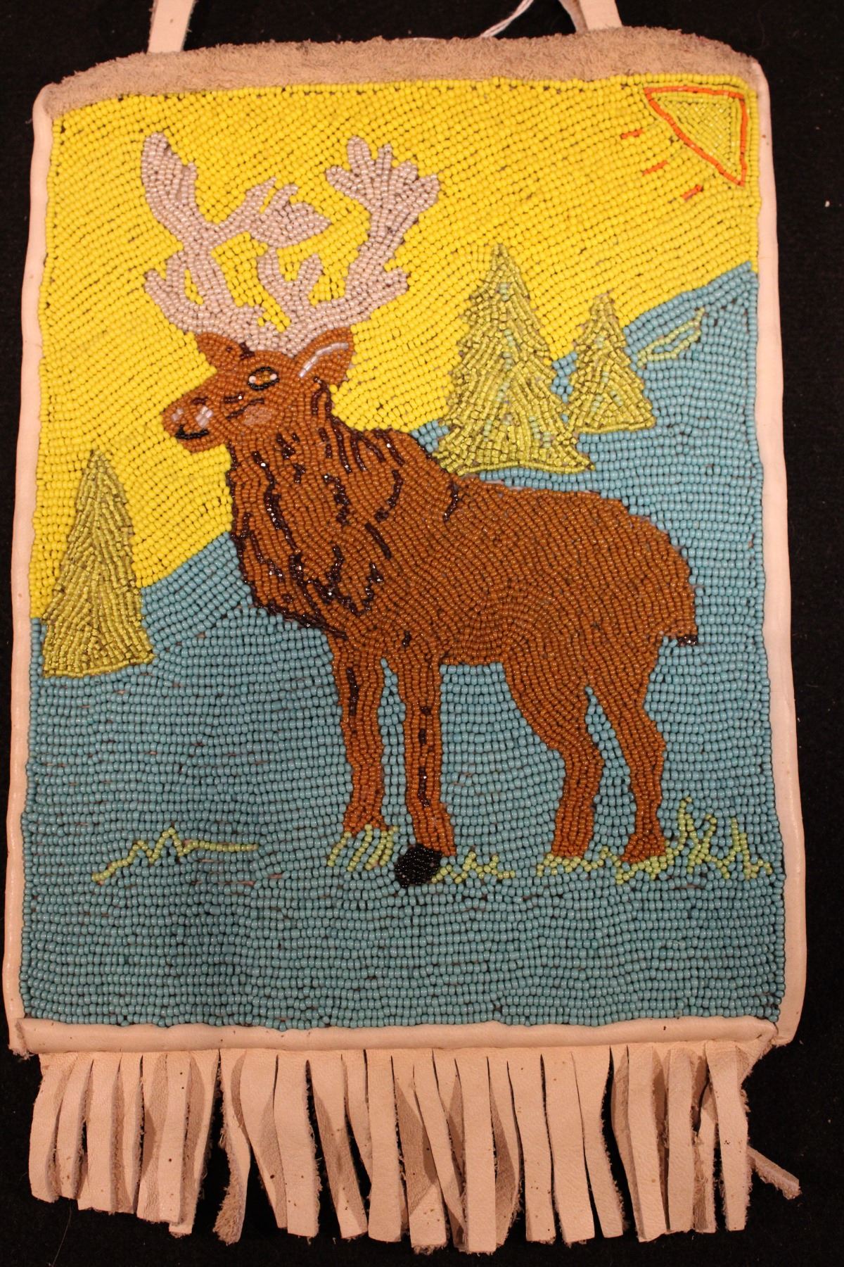 Ekl w/ trees, blue foreground and yellow sky. Hide binding and back. Fringe. 8" w x 10" h