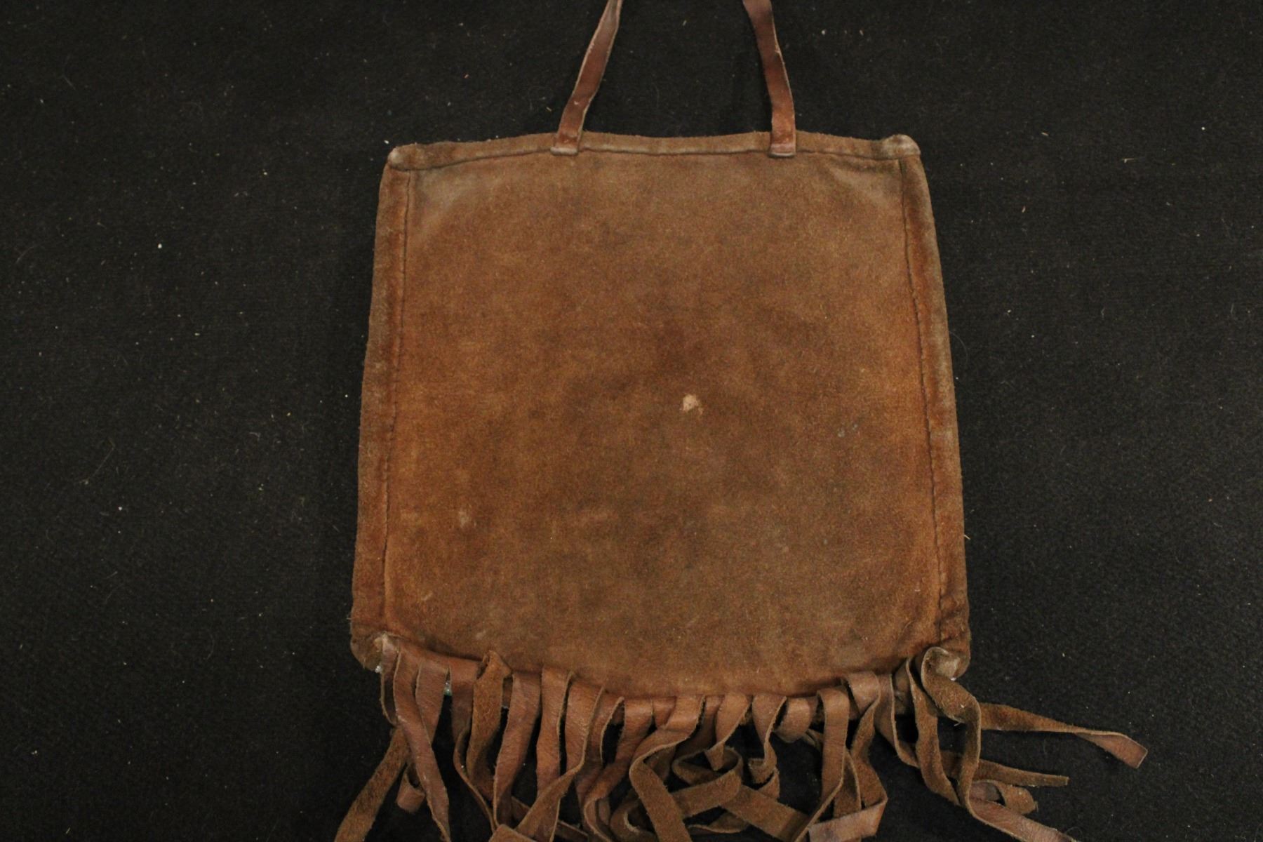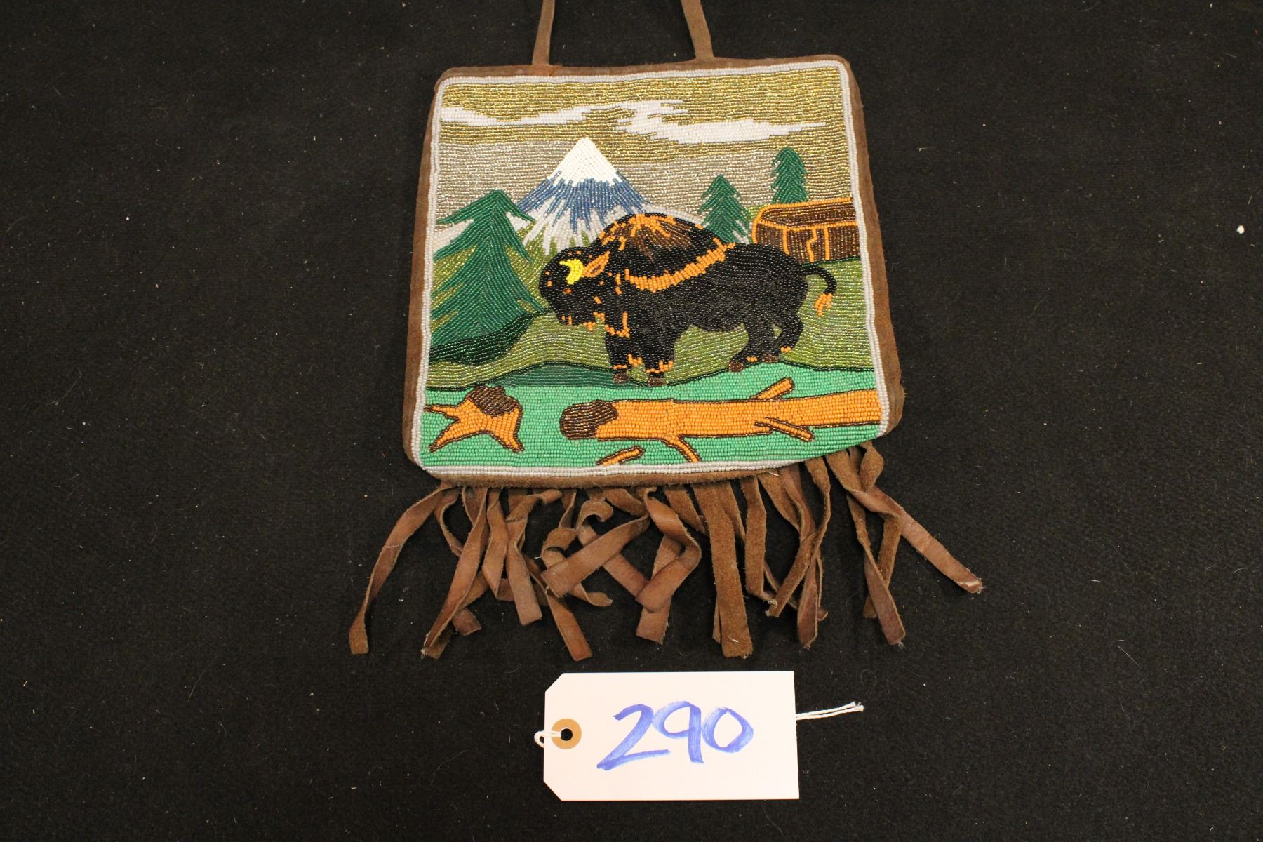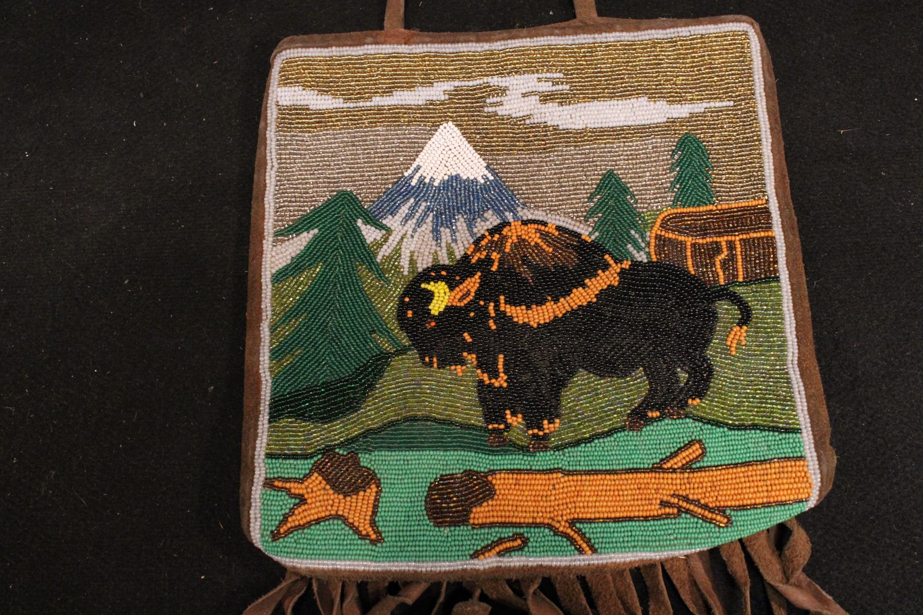Cecilia Totus style buffalo in forest w/ mountain and gold sky. Fringe. One handle missing. 10" x 10"