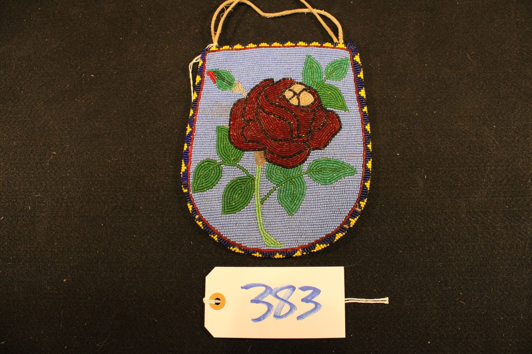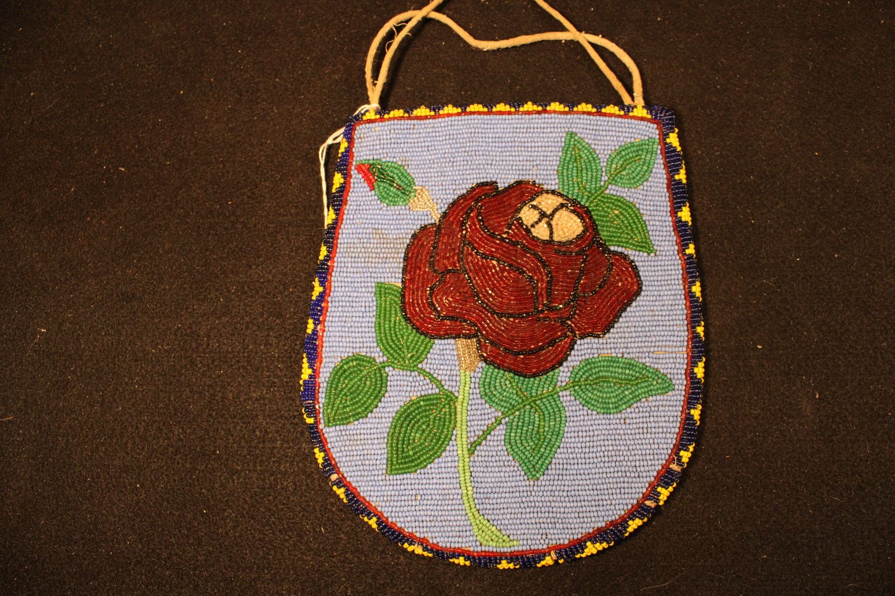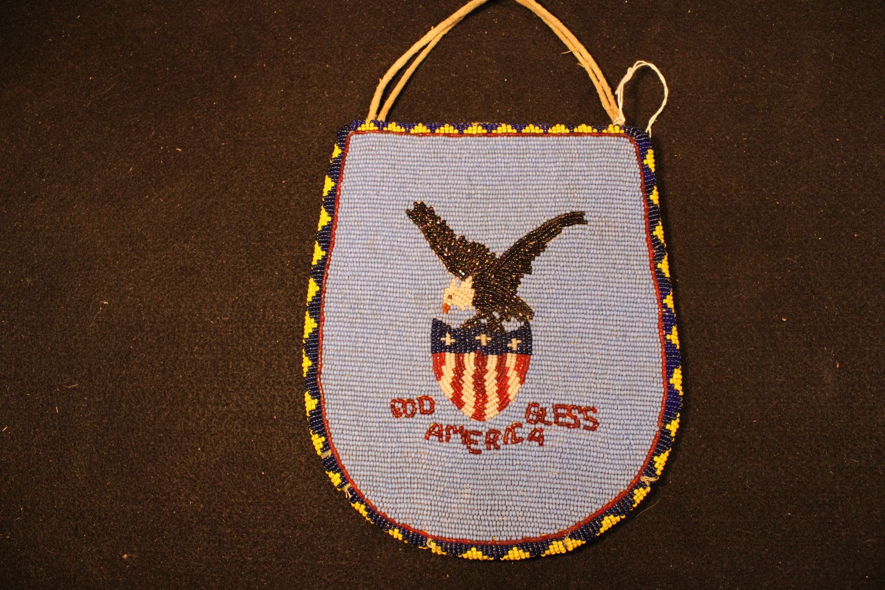 Shovel shaped. Two sided. Eagle/shield w/ God Bless America. Rose on blue backgournd. Beaded binding. Glass beaded. 6.75" w x 8" h