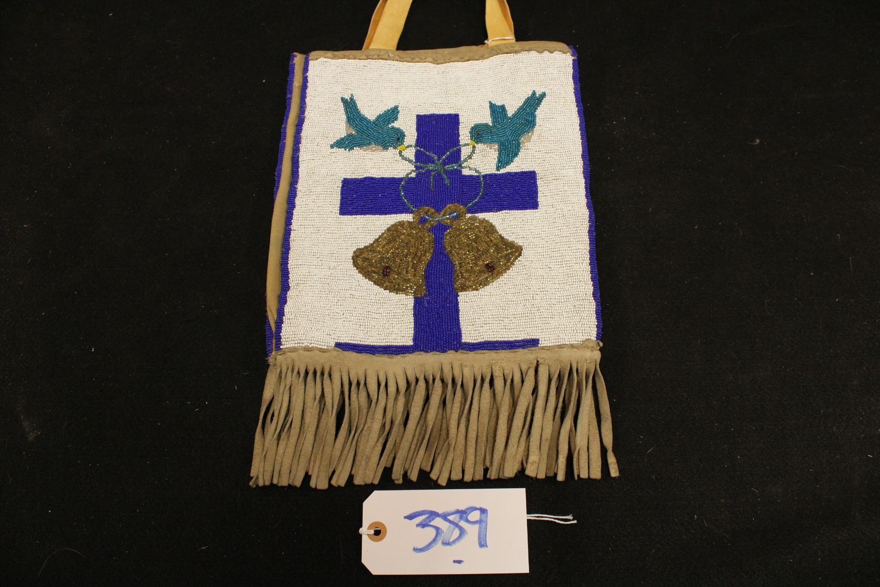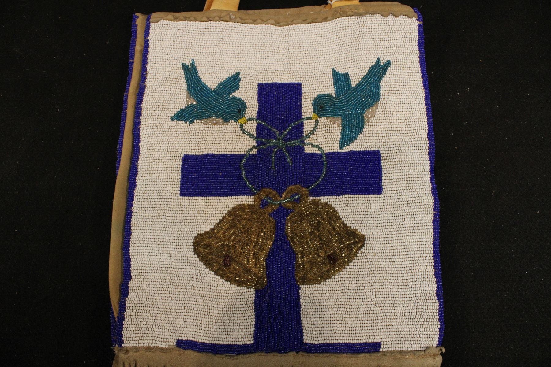 Birds w/ strings and bow. Bells and cross on white background. Beaded binding. Corduroy back. Cotton lining. Wedding bells. 10.25" w x 12" h