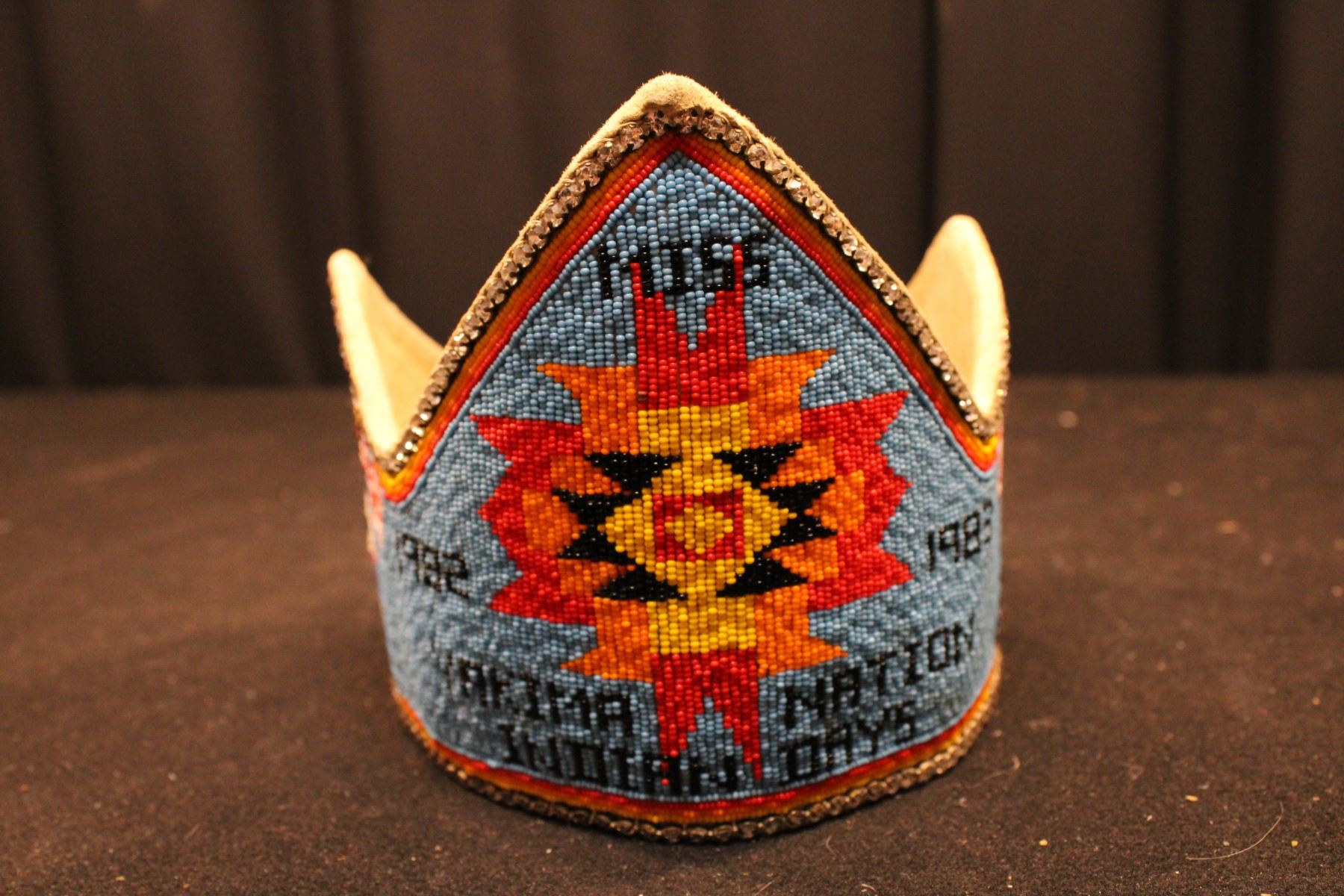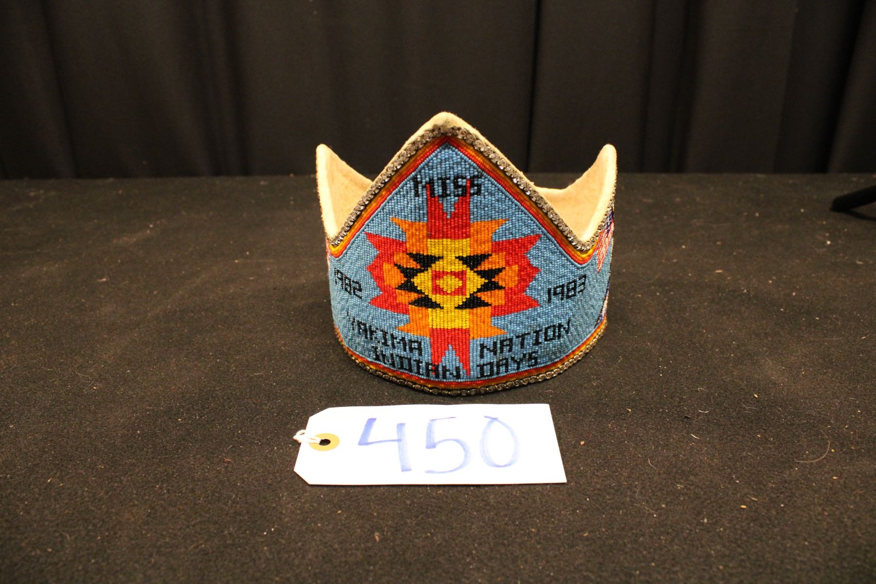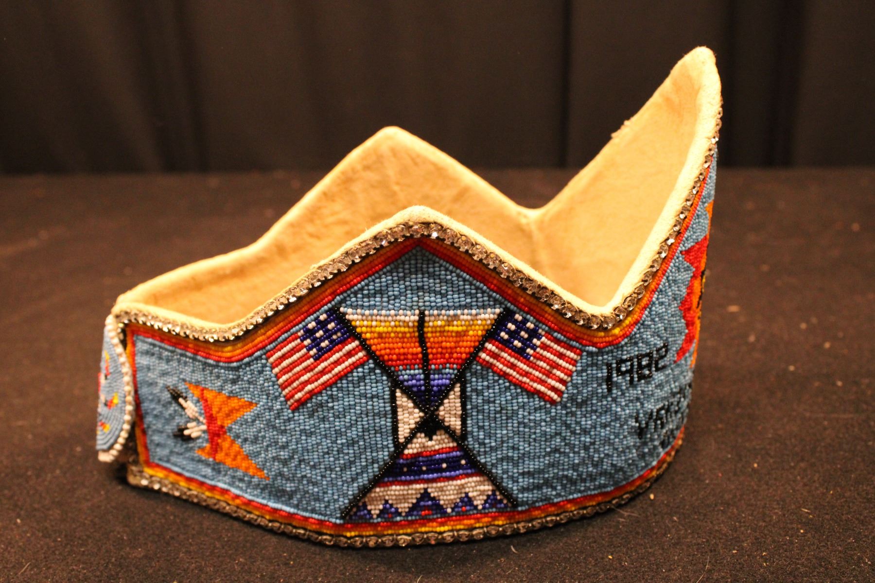 Miss Yakima beaded crown. Geometric design. Teepees w/ flags. Bucksin lined. 6" x 6"