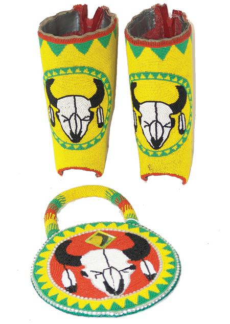 Circa 1980s, Very finely beaded ladies'/girls' leggings and matching purse with buffalo skulls done with tiny cut beads. Very good condition. 7" diameter bag, 8" x 11" leggings