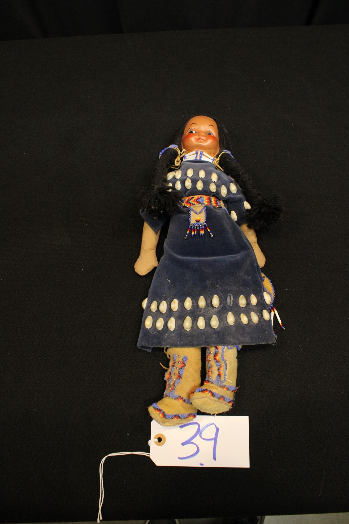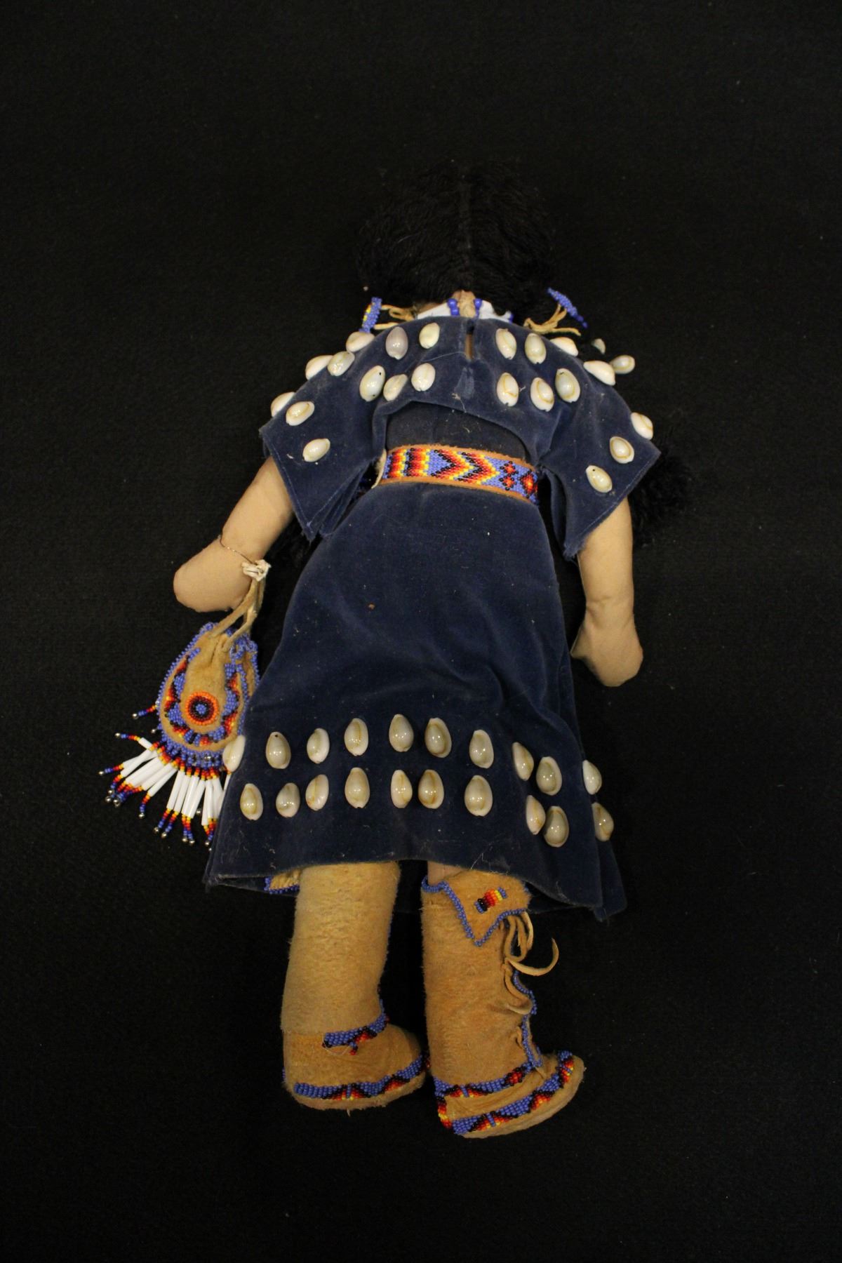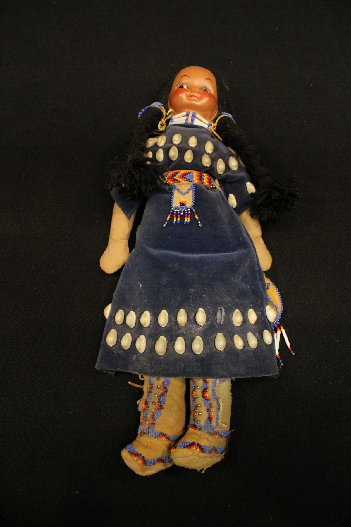 Blue beaded dress w/ shells and pouch, choker. Beaded high-top moccasins and bag. 17"