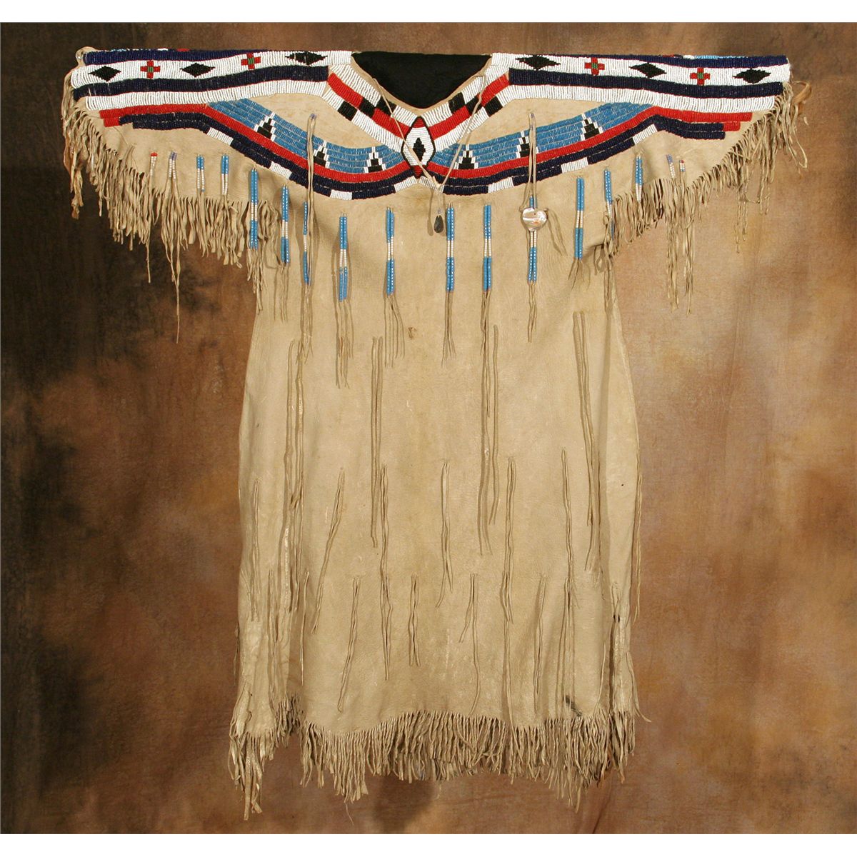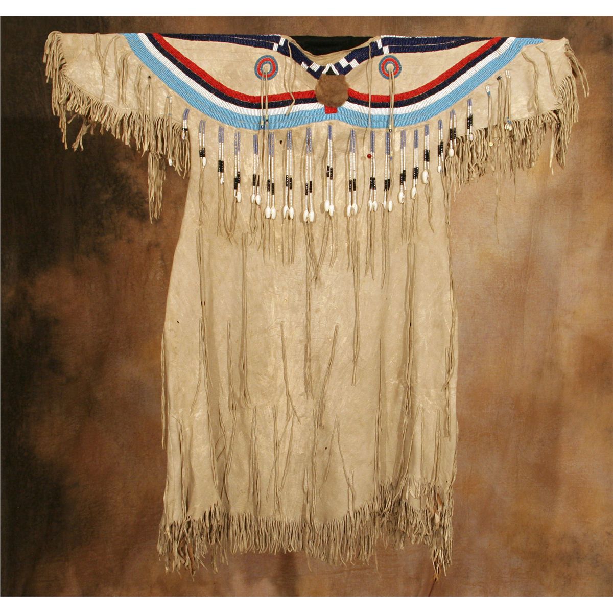 Plateau Dress. 48" x 45". Decorated with pony beads in classic colors. Accented with beaded drops, abalone disks, shells & hide. Lots of fringe. Late 19th-early 20th century. Provenance: Collection of Dr. Delwin & Karen Bokelman, PA., & pictured in their book Precious Dreams, page 16.