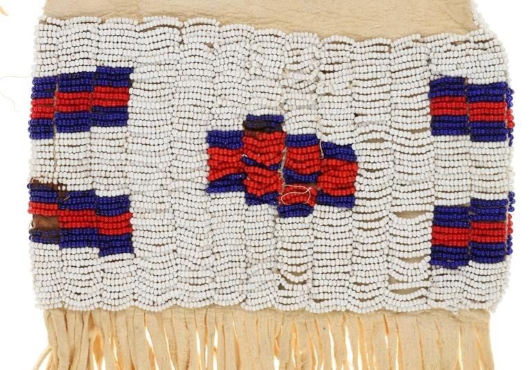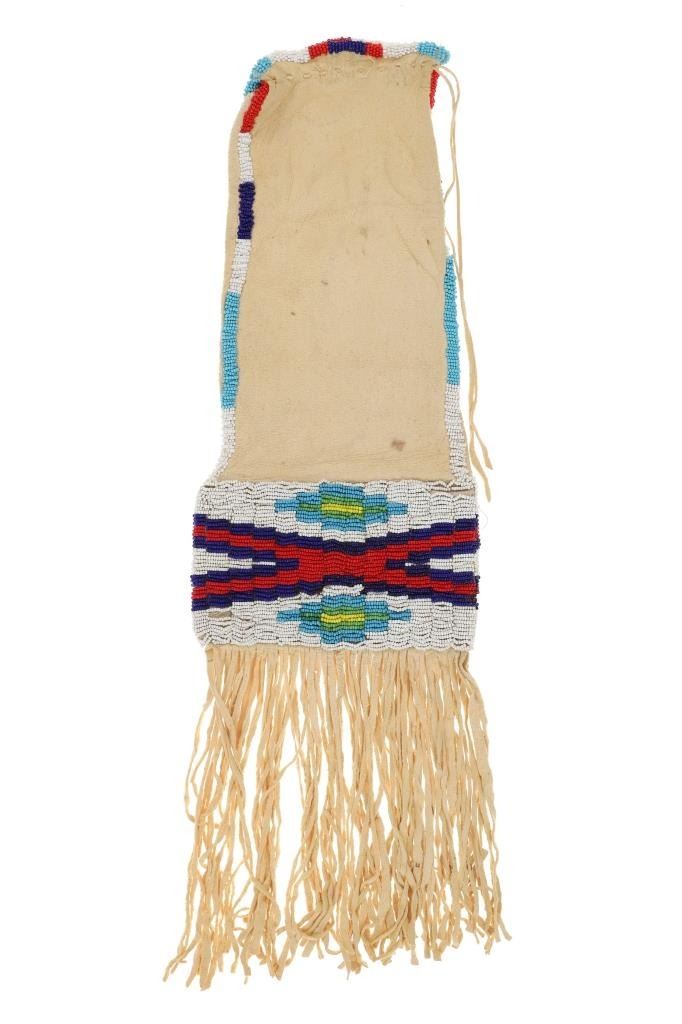 This is a nice early vintage beaded Elk hide large pipe bag from the Plateau region, likley Nez Perce. The piece is comprised of Rocky Mountain Elk Indian tanned hide with glass trade seed beads in a geometric design, beaded on both sides and up each side as well as around the opening. The bottom has thin Elk hide fringes and the hide overall on the bag is in good supple condition. The bag has some small bead loss, but overall displays well. There is a collection tag marked, ELK HIDE PIPE BAG $2,100.00 / MINT 14B7". A nice older 20th Century bag that measures 26"L by 7.75"W.