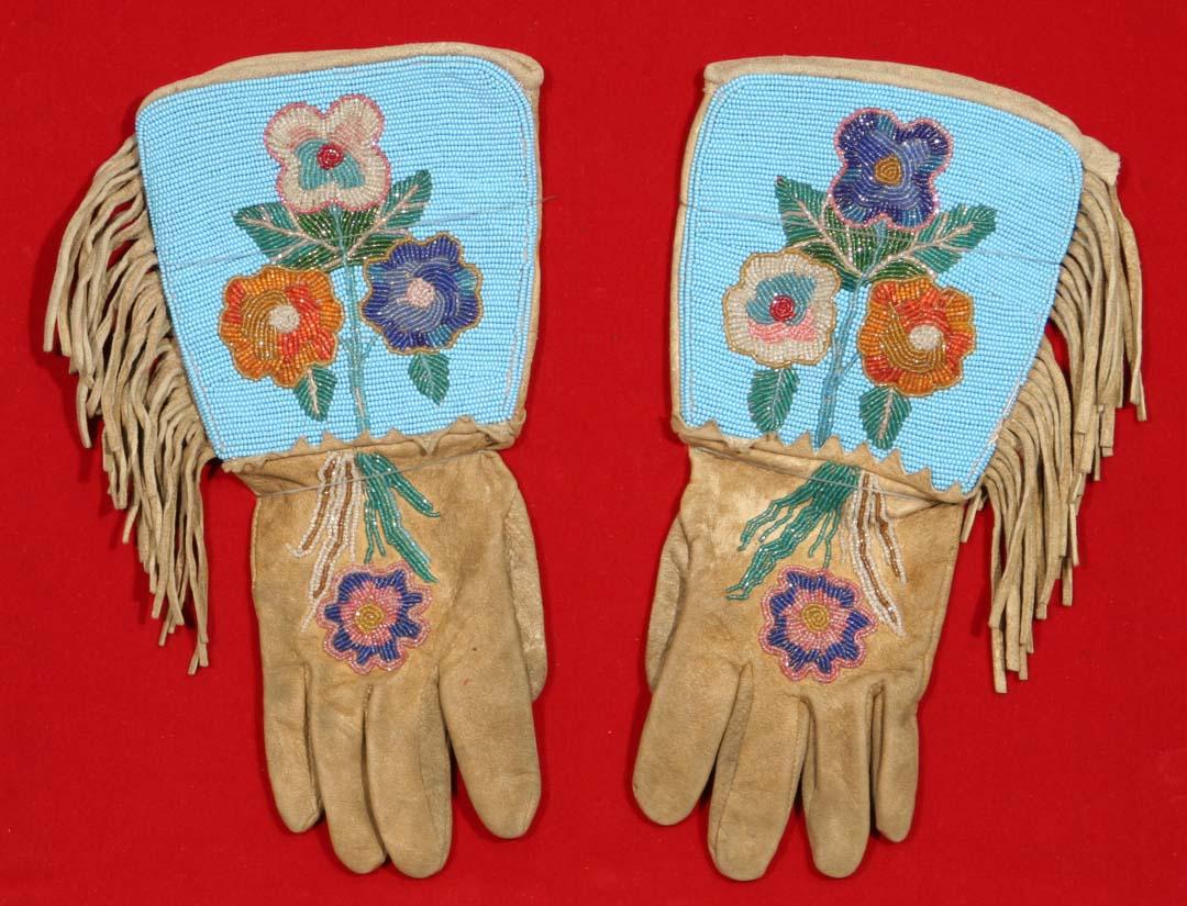 Plateau Beaded Gauntlets. 13" x 6". Cased in a shadowbox frame. Circa 1950s. (est $600-900). For condition reports please visit: www.auctioninsantafe.com/cr2011.pdf