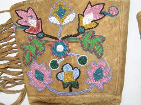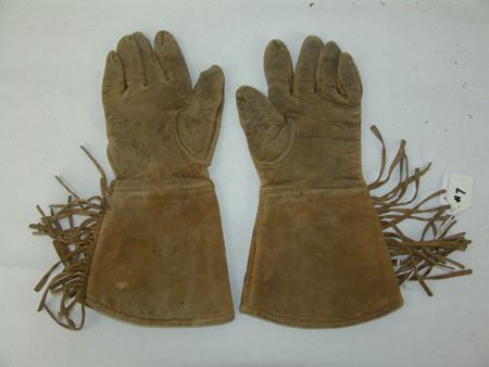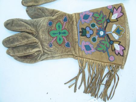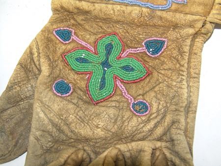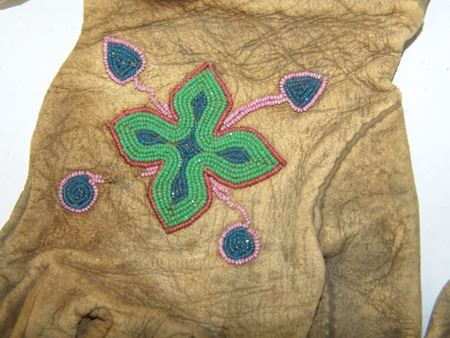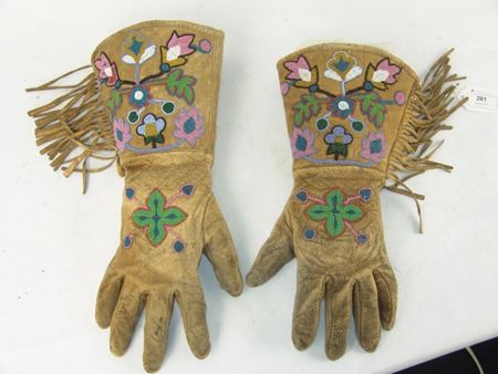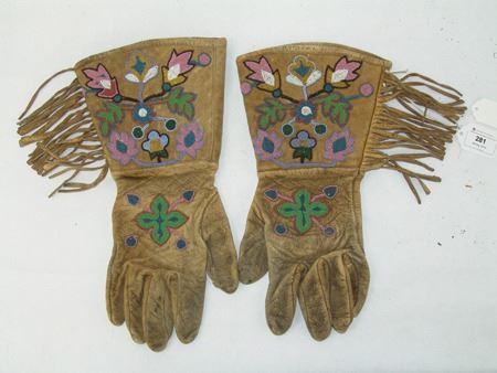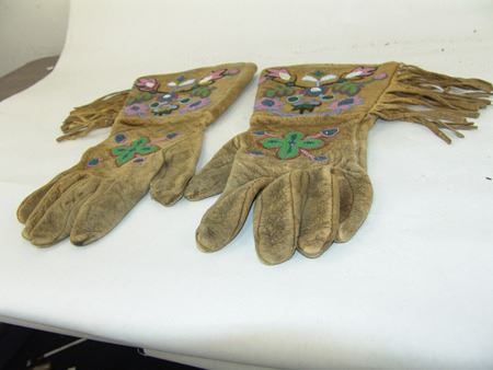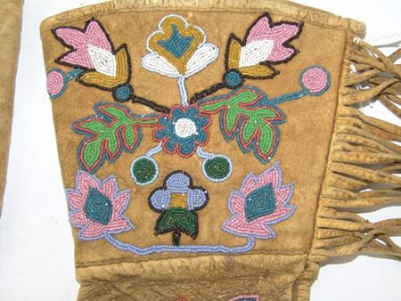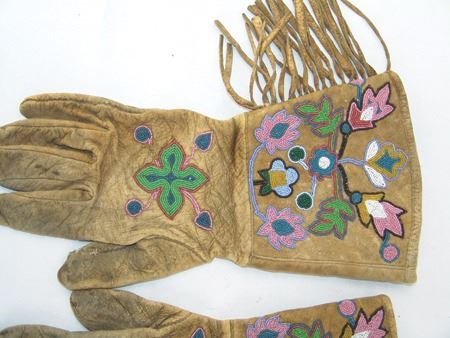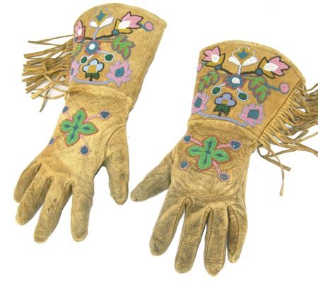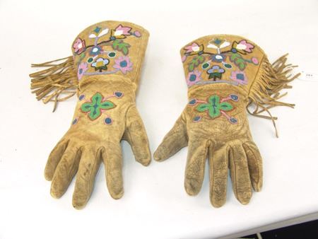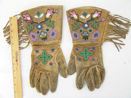 Early 1900s, Great pair of ladies' fancy buckskin gauntlets with beautiful contour beaded floral motif on the cuffs and back hands. Very good condition, minor bead loss. 13" long