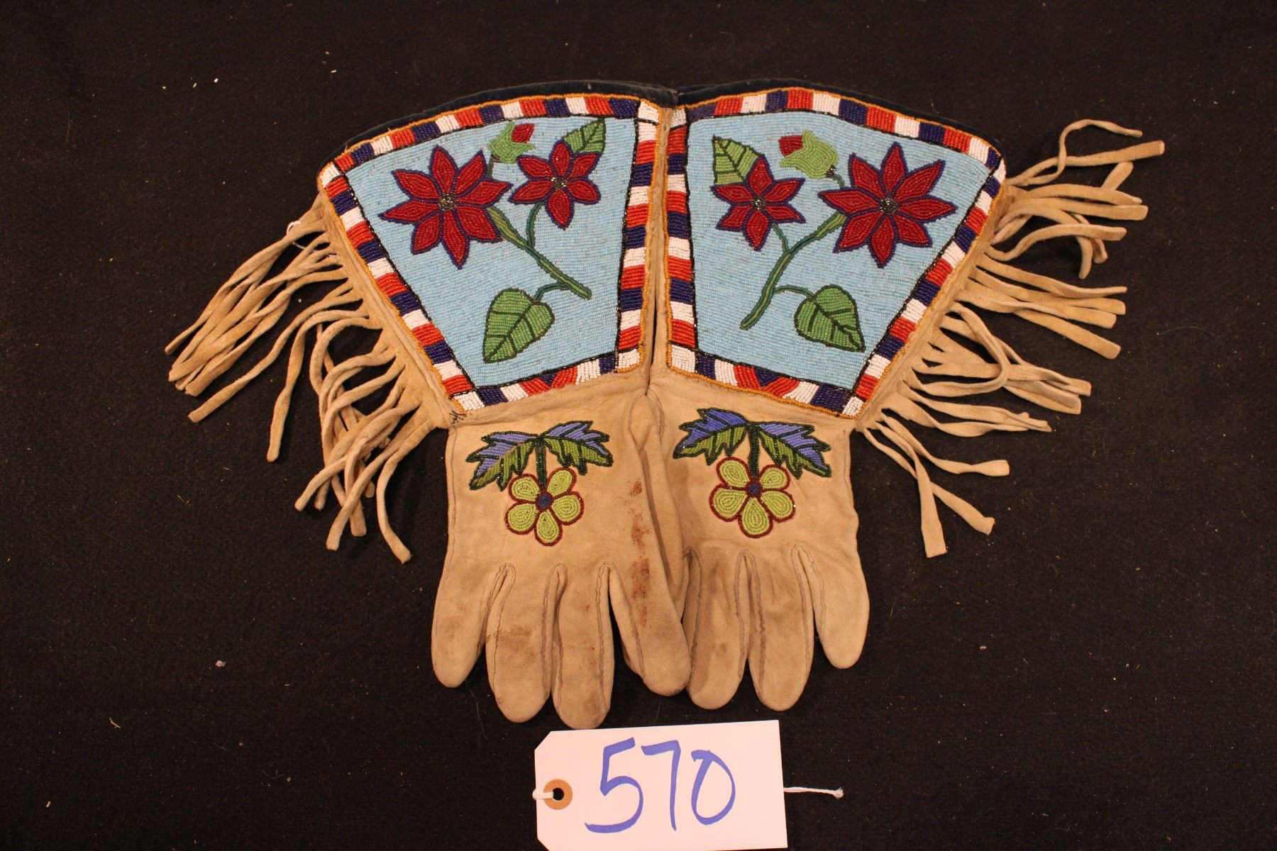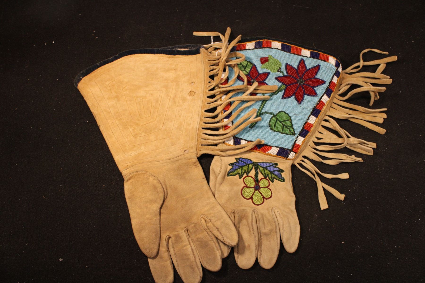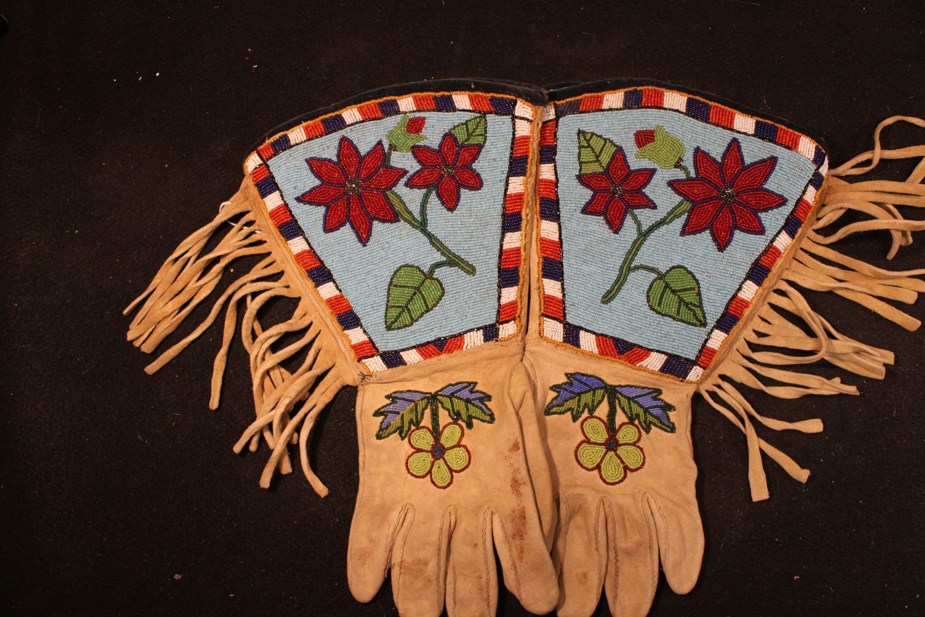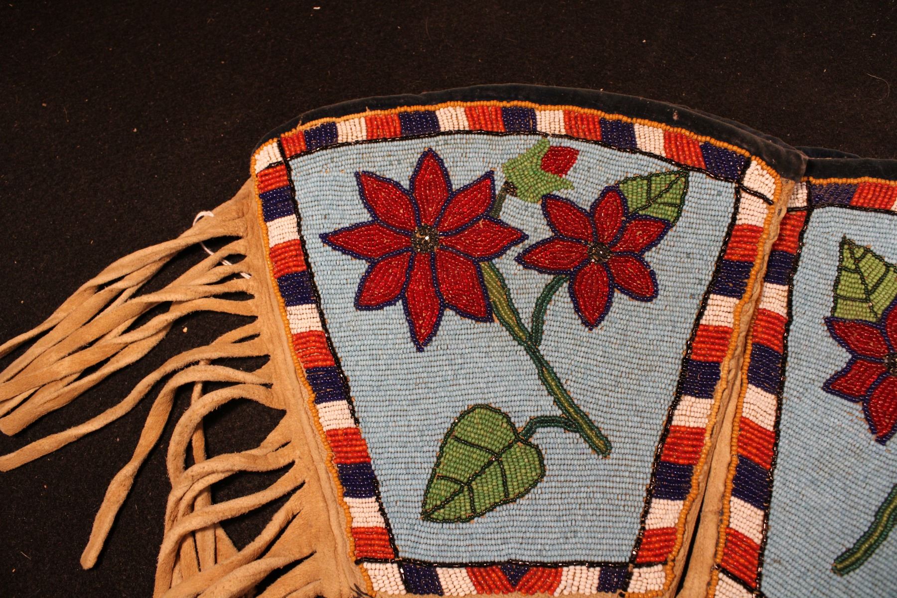 Fully beaded cuffs w/ flowers on blue background and checkerbaord pattern border. Flowers on hands.