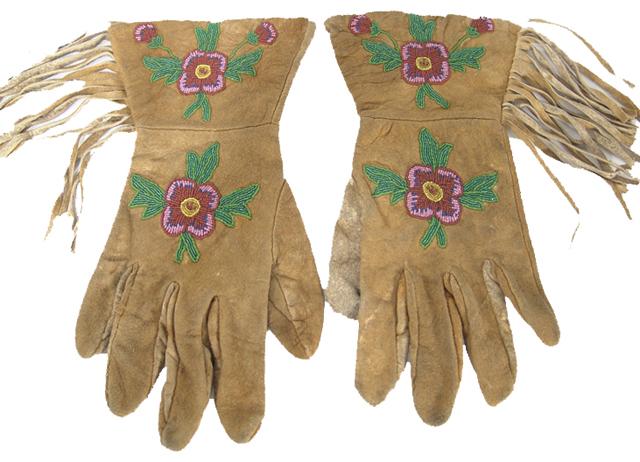 Beautiful pair of cloth-lined buckskin gloves with fine floral beadwork and long fringe. 11"