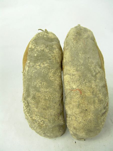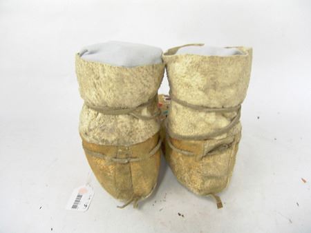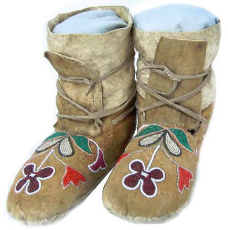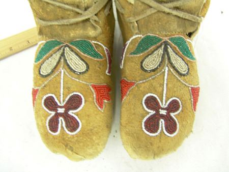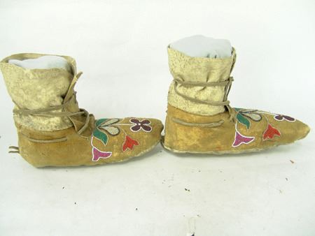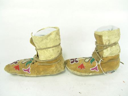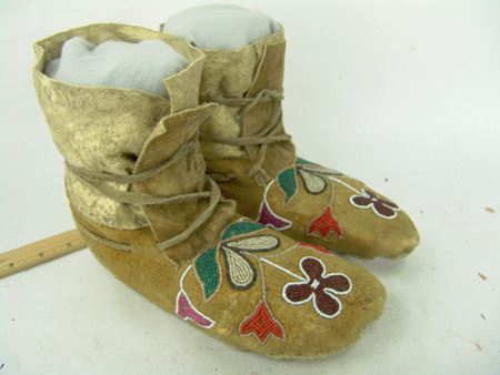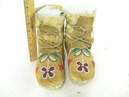 Ca. 1920s, Traditional pair of high top buckskin moccasins with soft soles and simple beaded floral design. Good condition. 10"