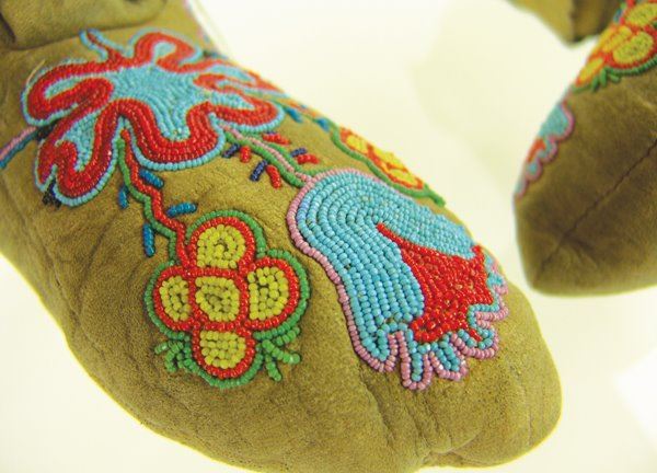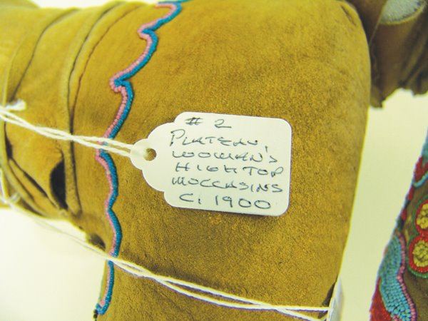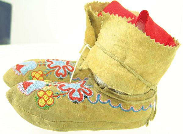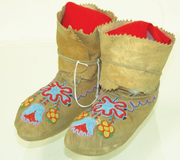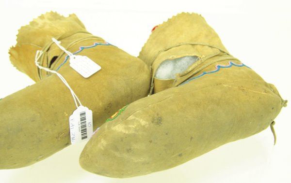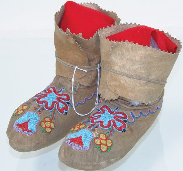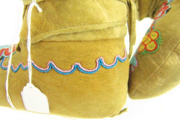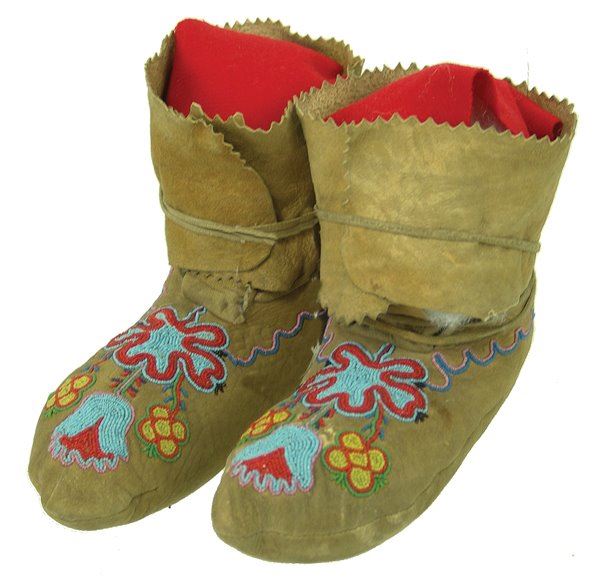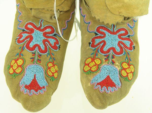 Outstanding pair of women's high top buckskin moccasins with soft soles and with fine, contour beaded florals on the vamps plus scallops around the ankles, done in tiny, 20/0 cut beads. Very good condition.