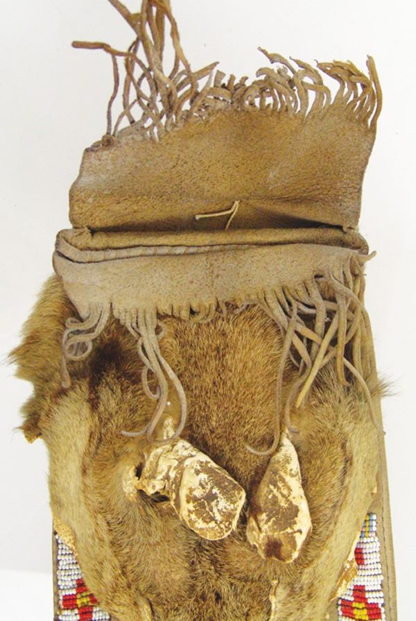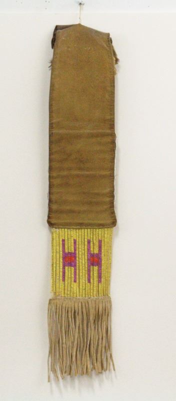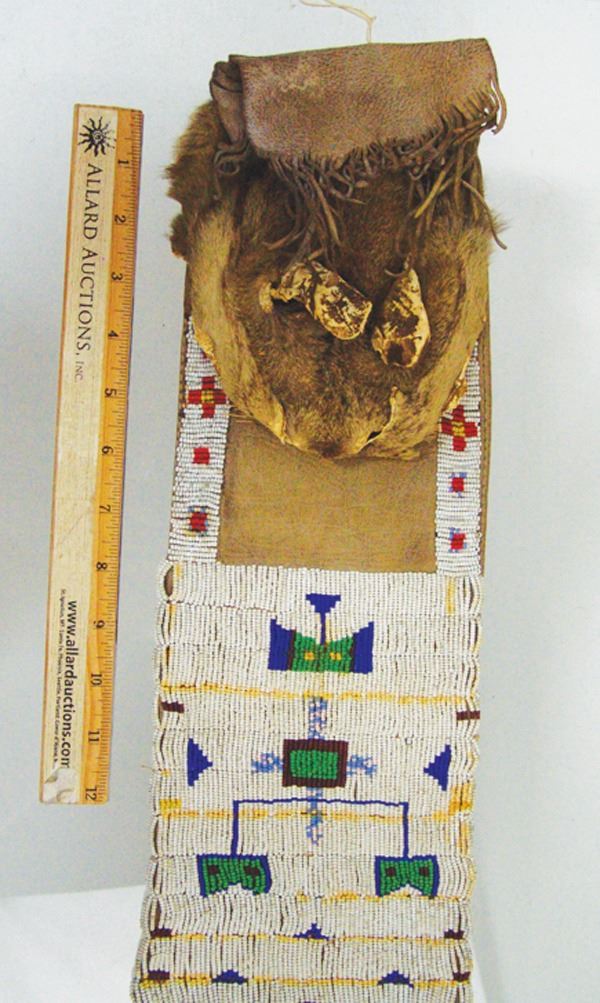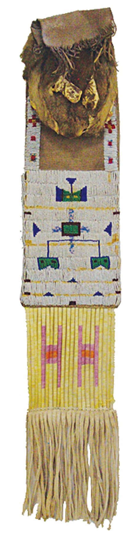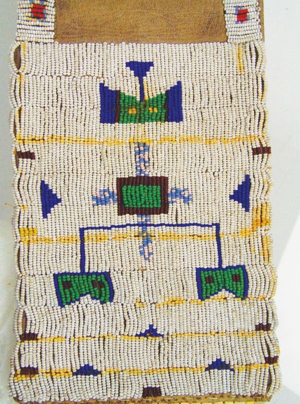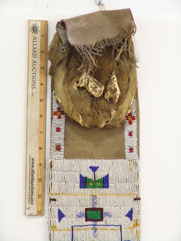 Unique, traditional pipe/tobacco bag the front beaded in long, lazy stitch with geometric designs, and with classic quilled slat suspensions and fringe, the folding top made from a lynx (?) head. Good condition.Early/Mid 1900s17" x 6" body
