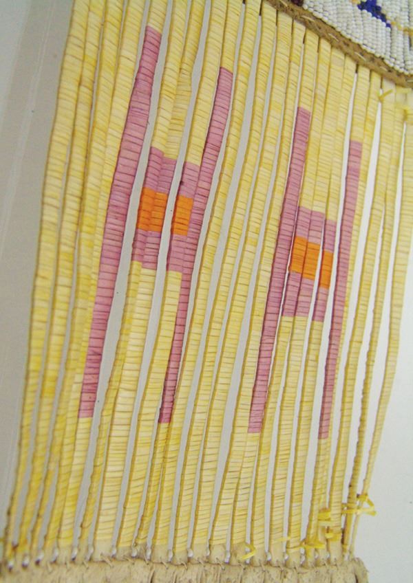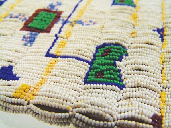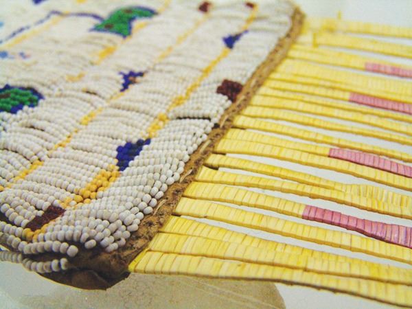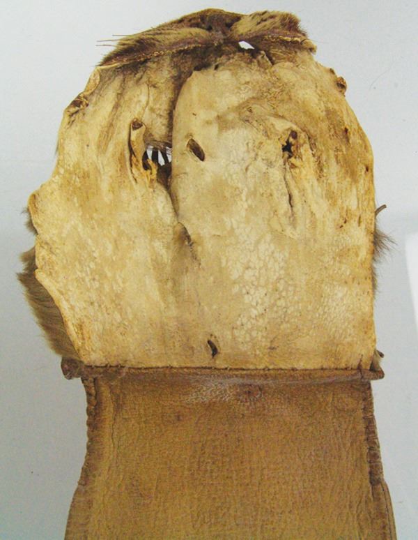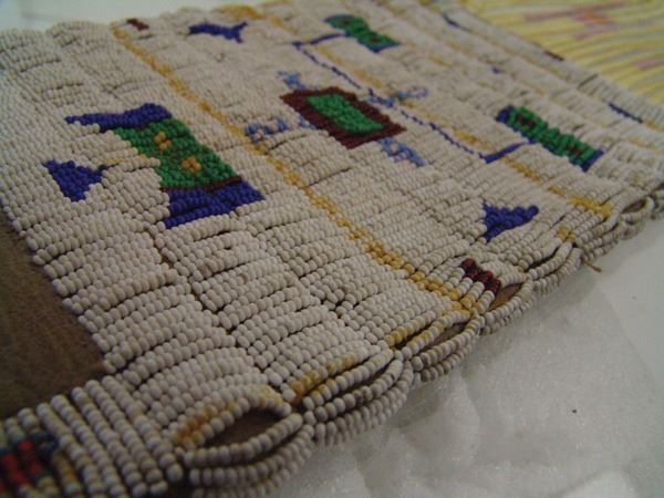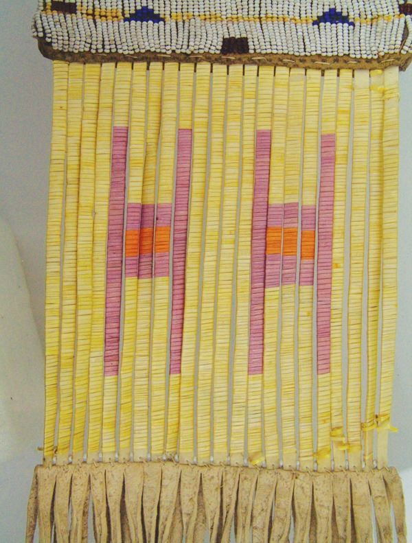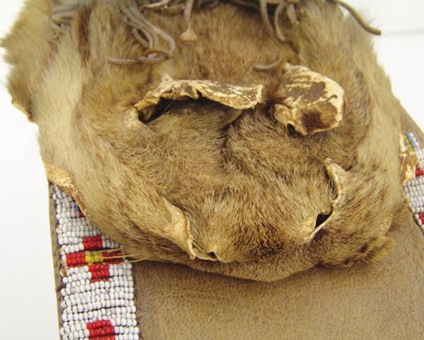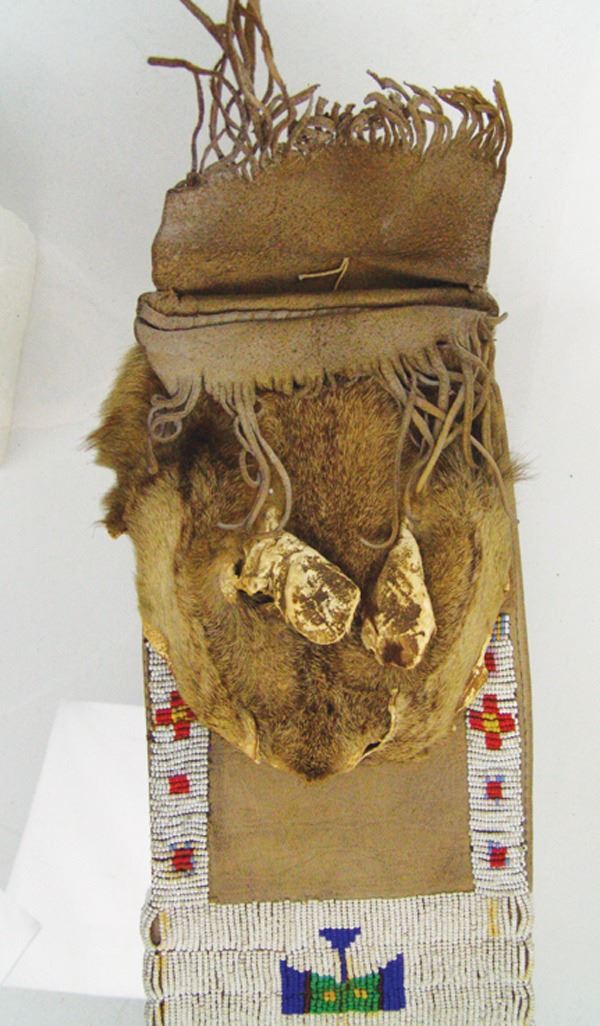 Unique, traditional pipe/tobacco bag the front beaded in long, lazy stitch with geometric designs, and with classic quilled slat suspensions and fringe, the folding top made from a lynx (?) head. Good condition.Early/Mid 1900s17" x 6" body