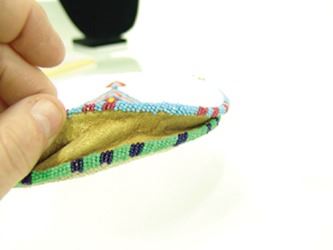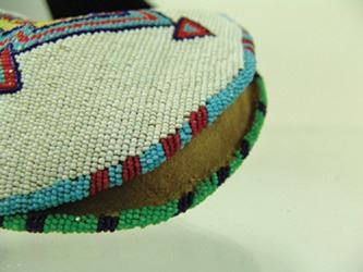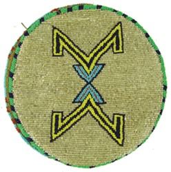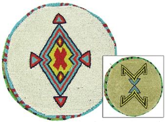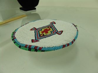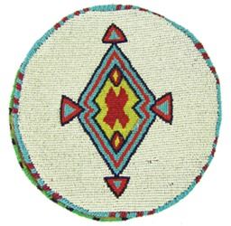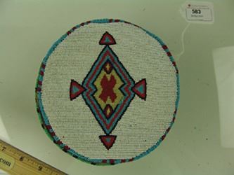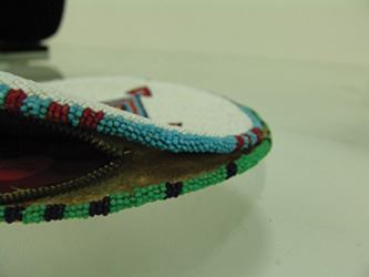 Vintage, two-sided, fully beaded round buckskin personal bag/purse with zip top and unique geometric designs that are different on the front and back. Very good condition. Great Patina. Ca. 1960s. 7"