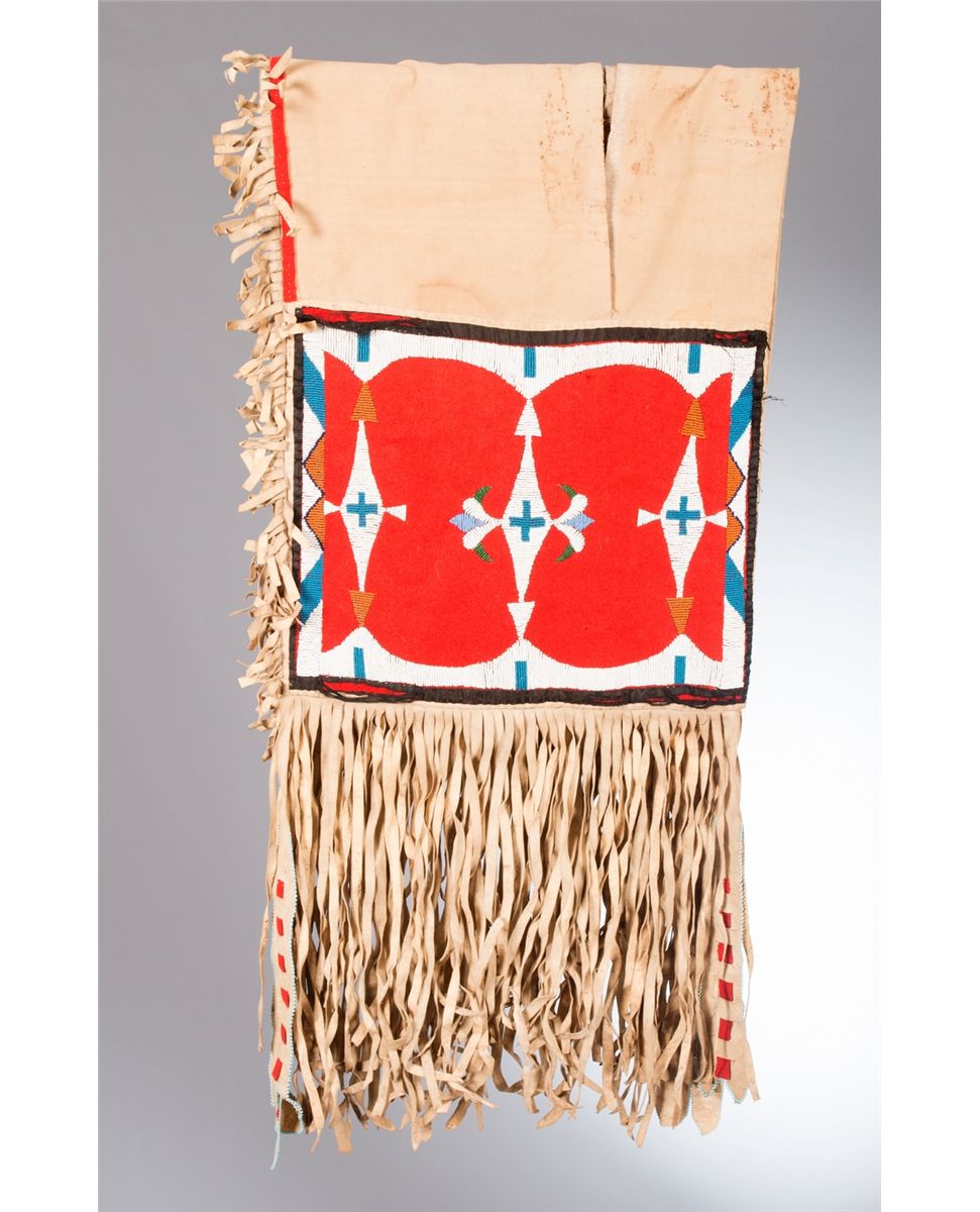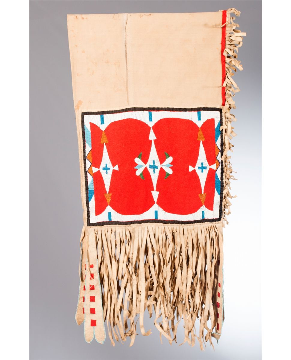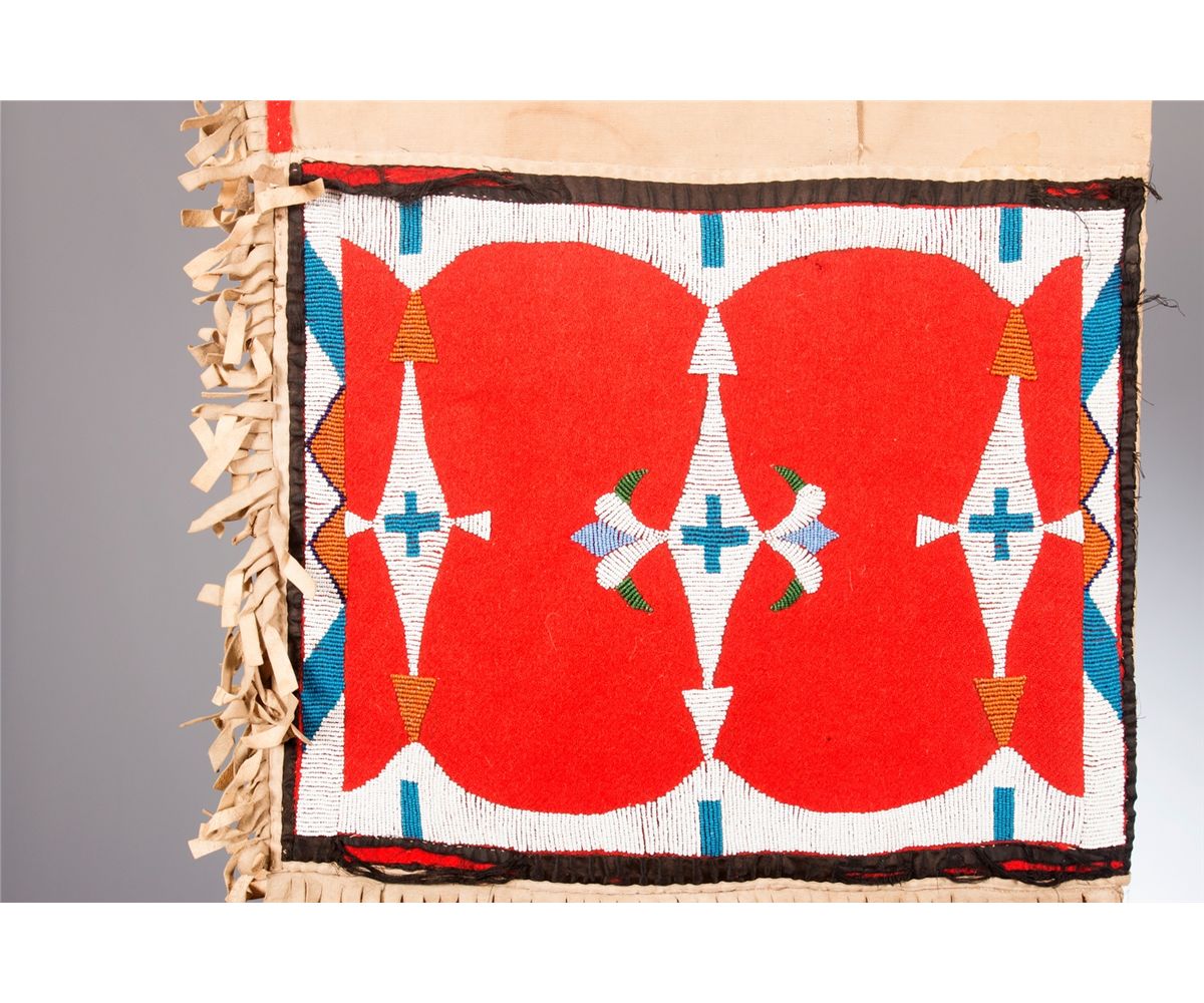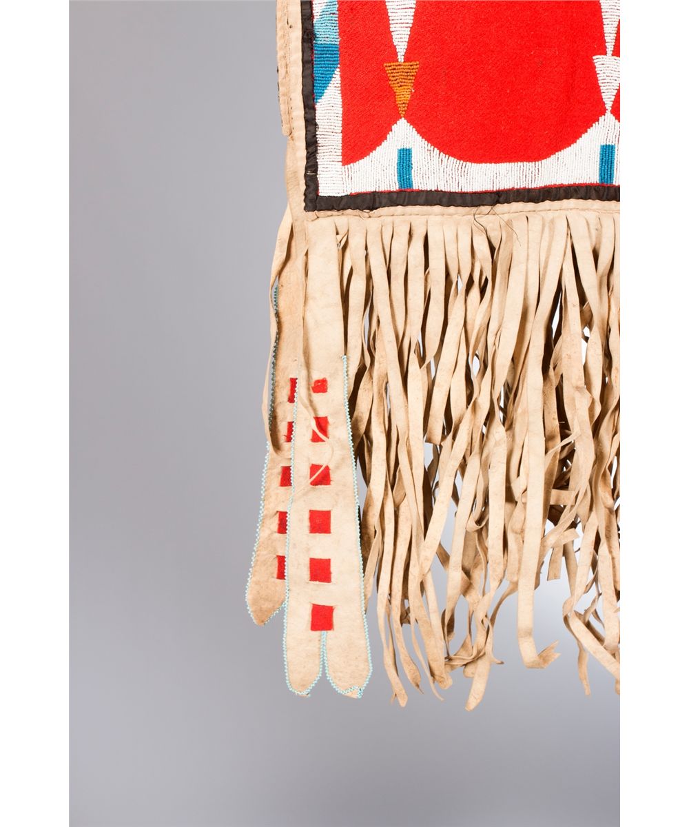 Plateau Saddle Drape. 51" x 18". Canvas center with 15" of beadwork on panels of red trade cloth edged with black seam binding. 17" of fabulous fringe adorns both ends, accented by two beaded fringe drops on each side. Very showy. Early 20th century. Provenance: Greg Perillo collection.