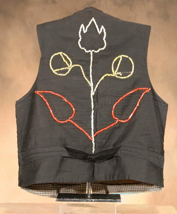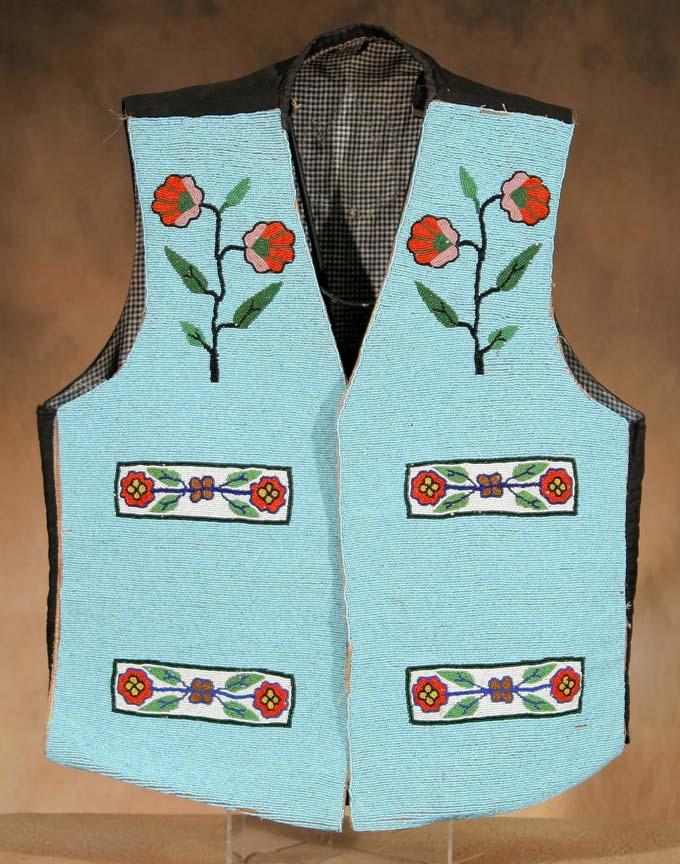 Plateau Beaded Vest. 20" x 17". Fully beaded front, partially beaded back. Circa 1900-1910. (est $1,000-1,500). For condition reports please visit: www.auctioninsantafe.com/cr2011.pdf