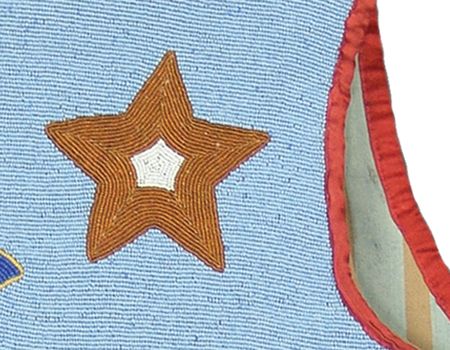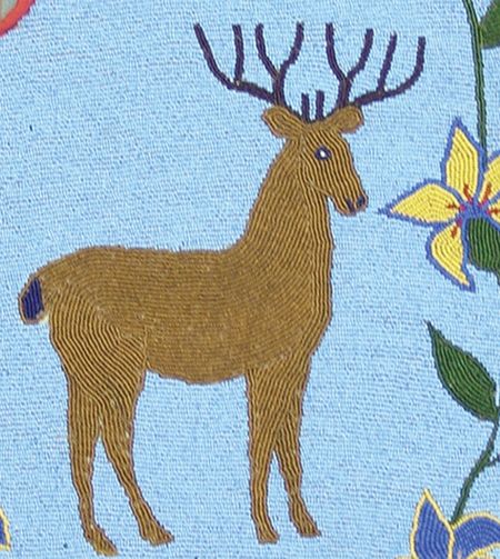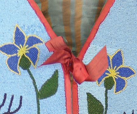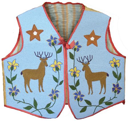 Early 1900s, Outstanding beaded pictorial vest, probably Flathead, with rare deer figures, flowers, and stars. Very good condition, a true showpiece. 23" x 22"