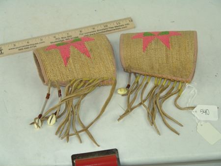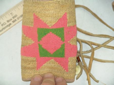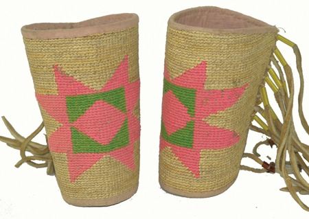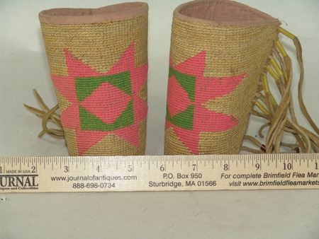 Mid 1900s, Rare child's sized hand woven cornhusk cuffs with pink woolen diamond in box in star design, cotton lining, and thick fringe. Very good condition. 5-1/4" x 9-3/4"