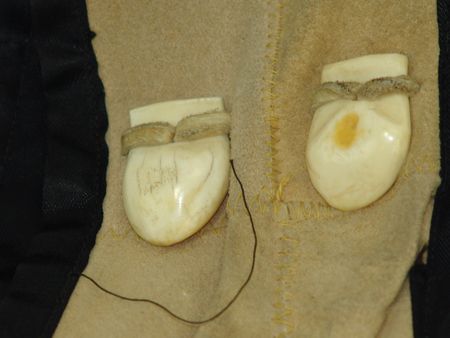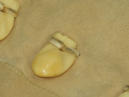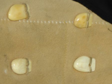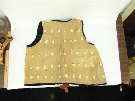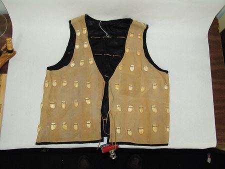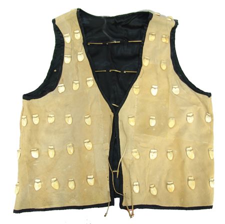 Ca. 1970s, Handcrafted patchwork buckskin vest, covered front and back with real and carved bone "elk teeth." Very good condition. Mens' Medium/Large