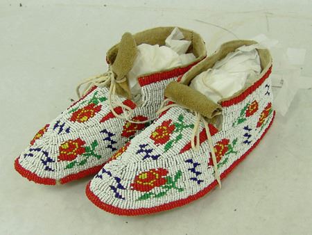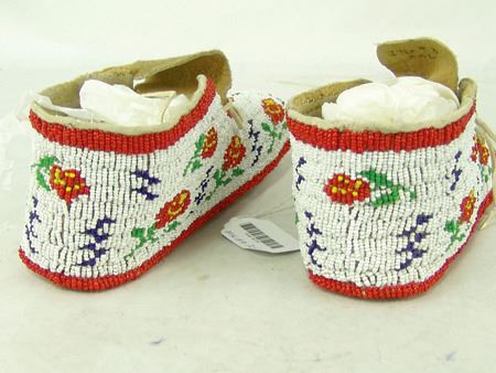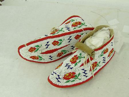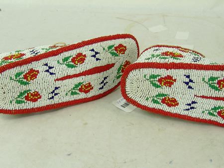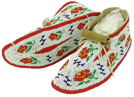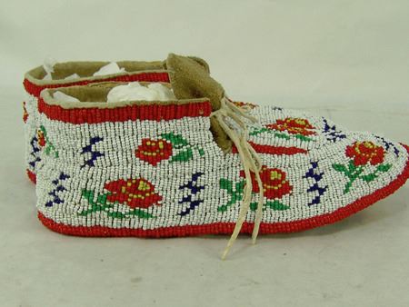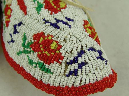 Mid 1900s, Outstanding sinew sewn and lazy stitch beaded (including soles) hard soled buckskin moccasins with beautiful red roses on a white ground. Excellent condition. 10" x 3-1/2"