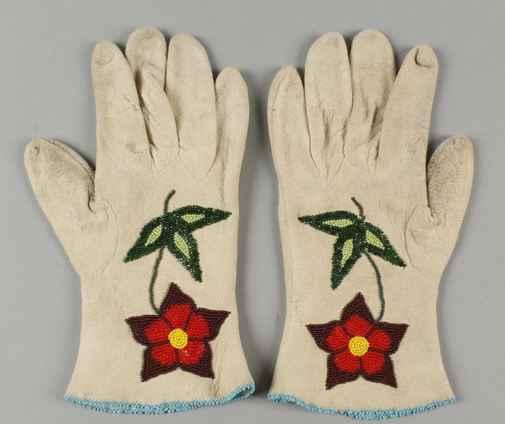 Plateau women's gauntlets with beaded floral design circa 1920's. Minor losses to beadwork inside flower, otherwise very good overall.