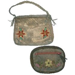Plateau Indian bag & pouch (2 pcs.); colorful cut & seed beads decorate both sides of bag, both items are deer hide, one w/braided trim & handle, both c.1930 & VG condition, 7.5" & 8.5"W.