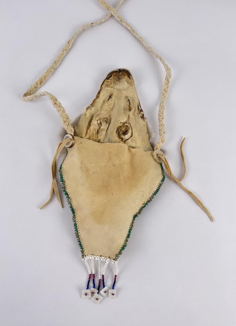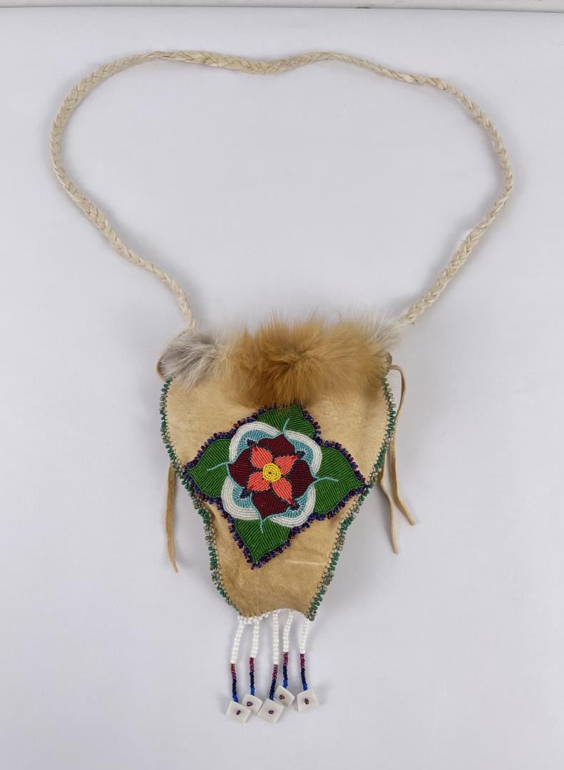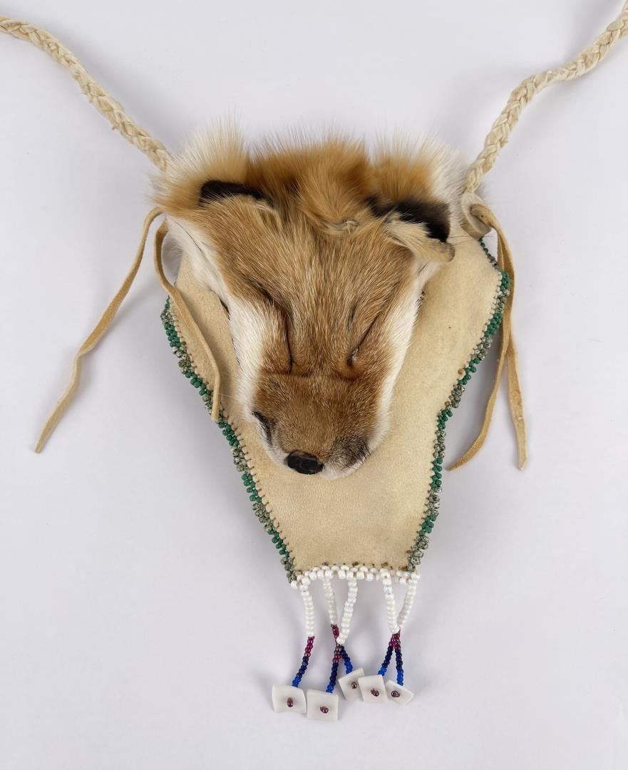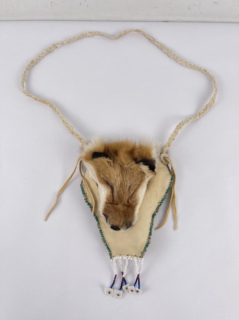 Very nice bag. Beaded as shown. Shell drops with a fox head flap. Second half of the 20th Century. 30" long including handle.