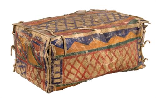 Plateau Parfleche Box. 16" x 9" x 6 1/2". Strong painted designs. 19th century. Good condition. (est $1,500-2,500)