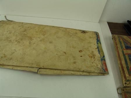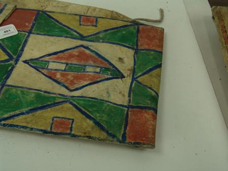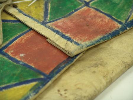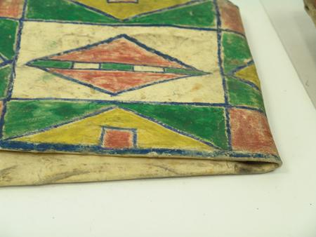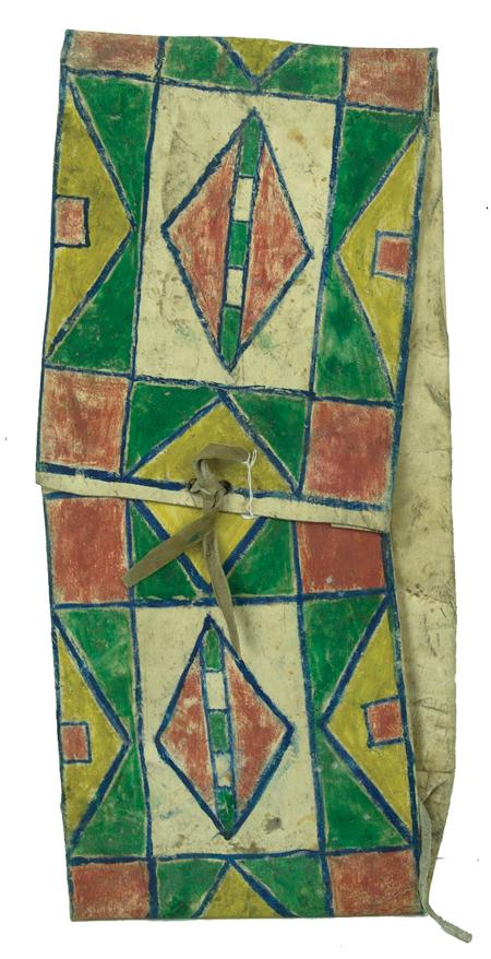 Circa Mid 1900s, Classic folded rawhide container with traditional mineral painted geometric designs. Very good condition. 26-1/2" x 13"