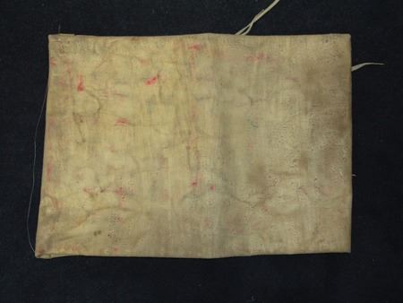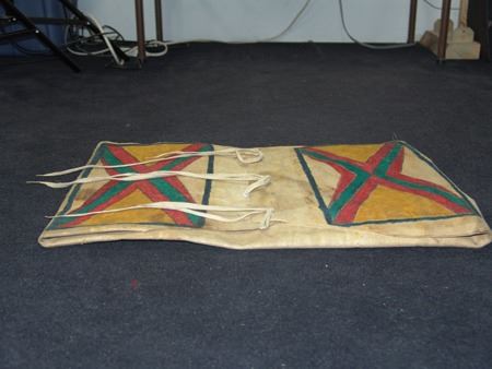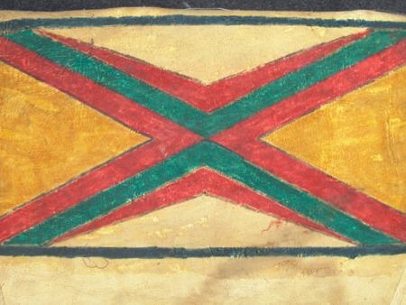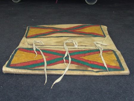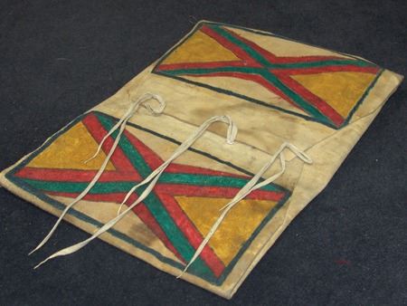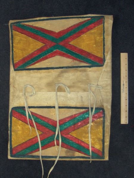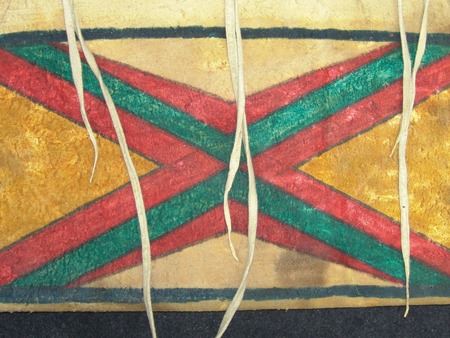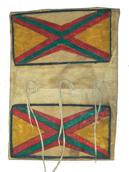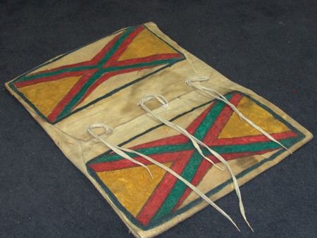 Ca. 1980s, Large and colorful folded and shaped rawhide case with unique, traditional (but horizontal) painted cross or "X" designs on the front panels. Very good condition. 25" x 18"