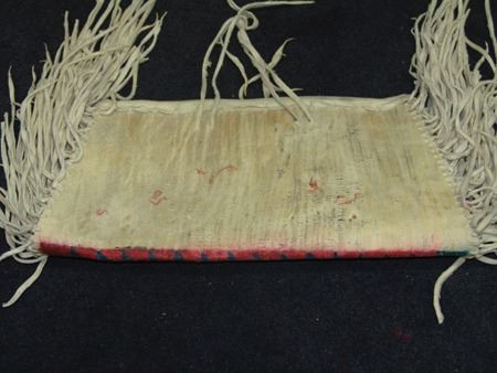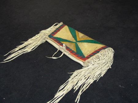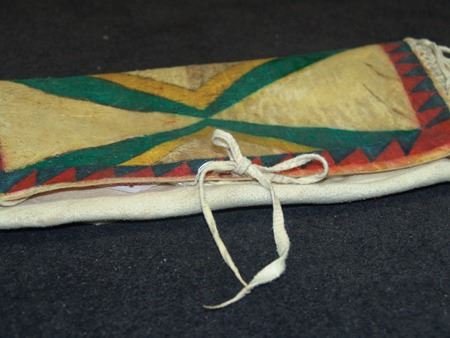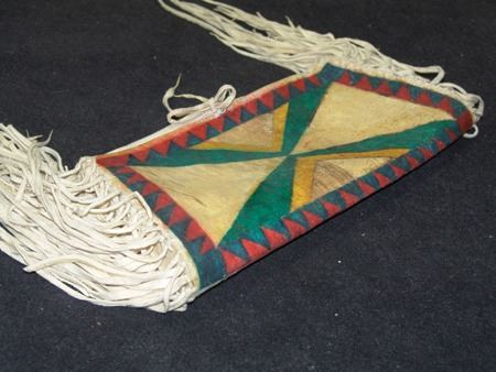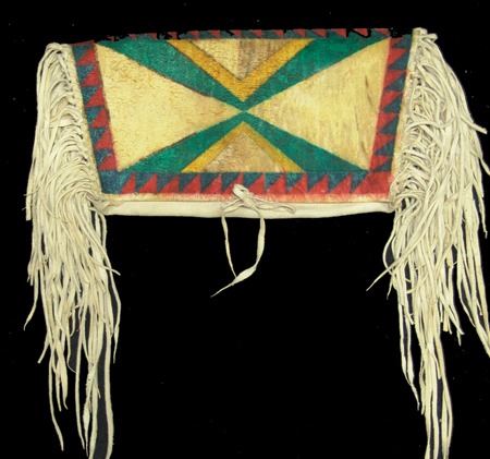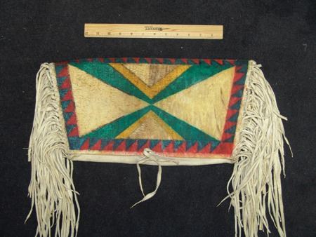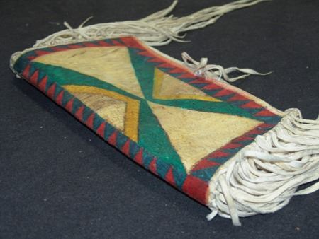 Ca. 1980s, Hand crafted shaped hard rawhide medicine case with painted geometric designs and heavy hand cut fringe. Very good condition. 9-1/2" x 17" + fringe