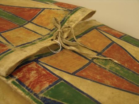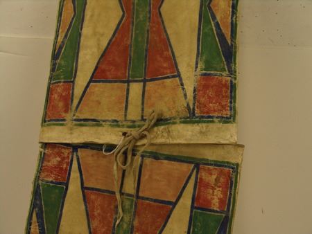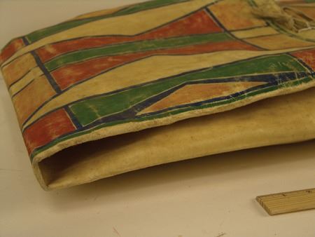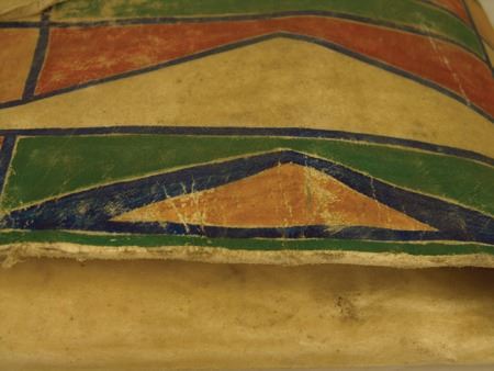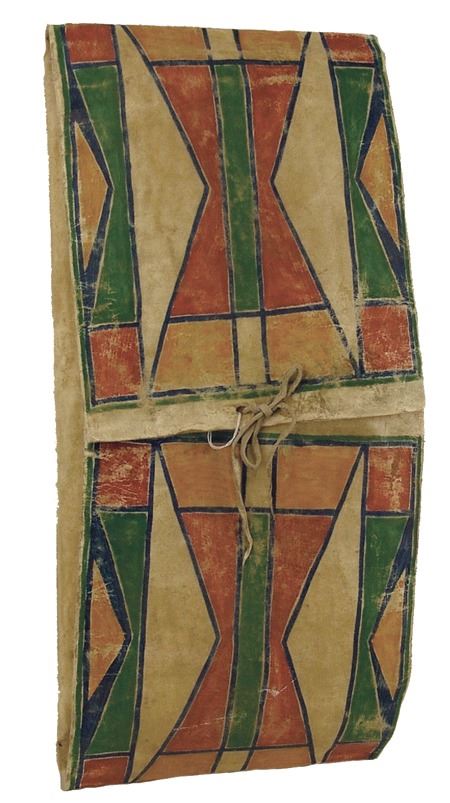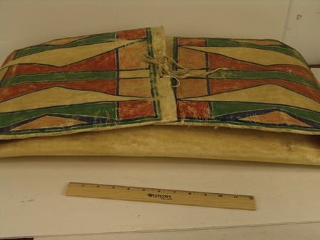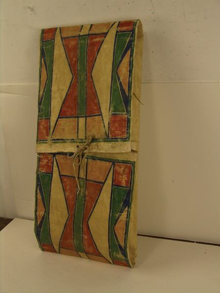 Mid 1900s, Large classic-style folded heavy rawhide case with traditional mineral painted designs. Very good condition. 12" x 28"