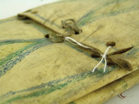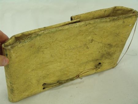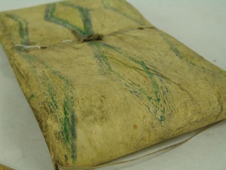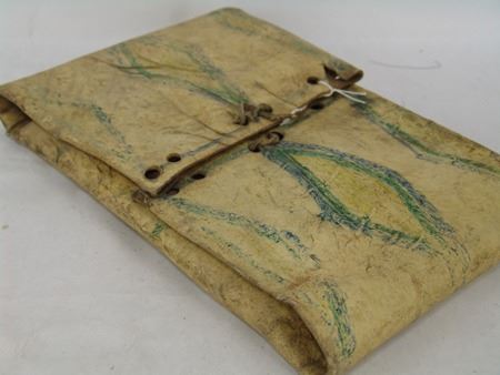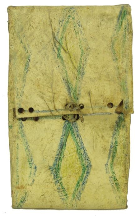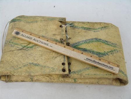 Early 1900s, Smaller shaped hand painted folded rawhide container with traces of the original geometric design still visible. 8-1/2" x 13"