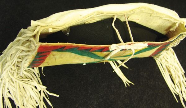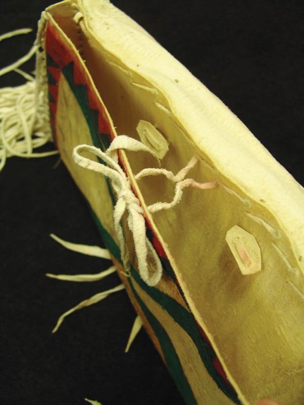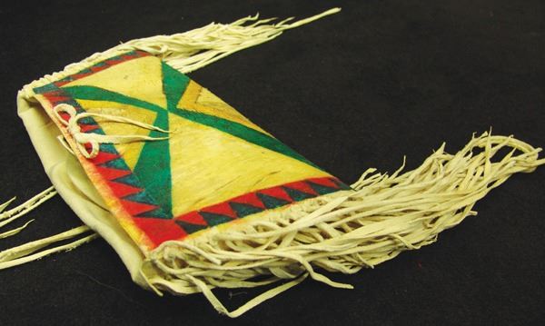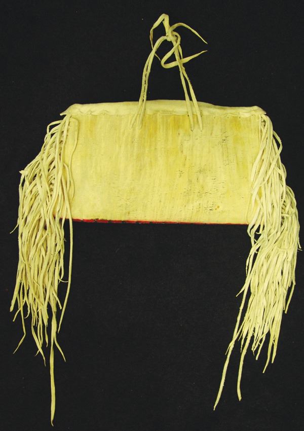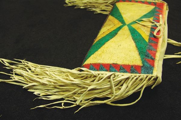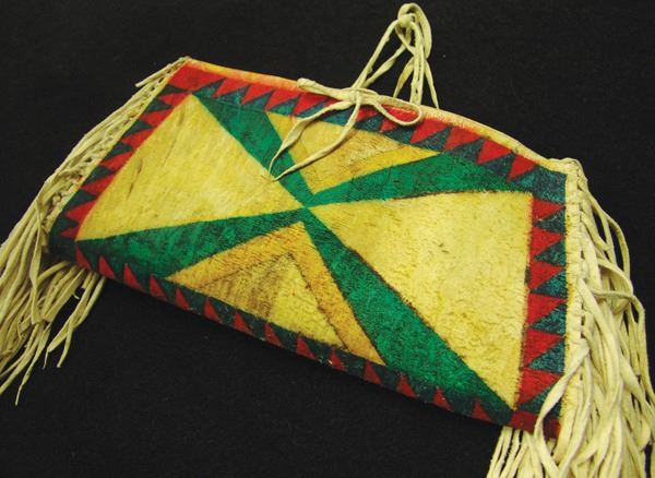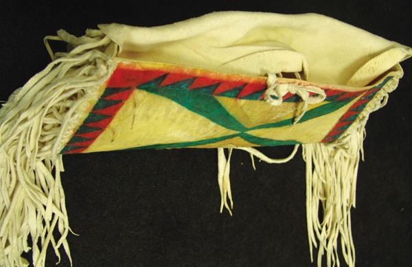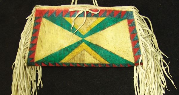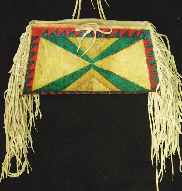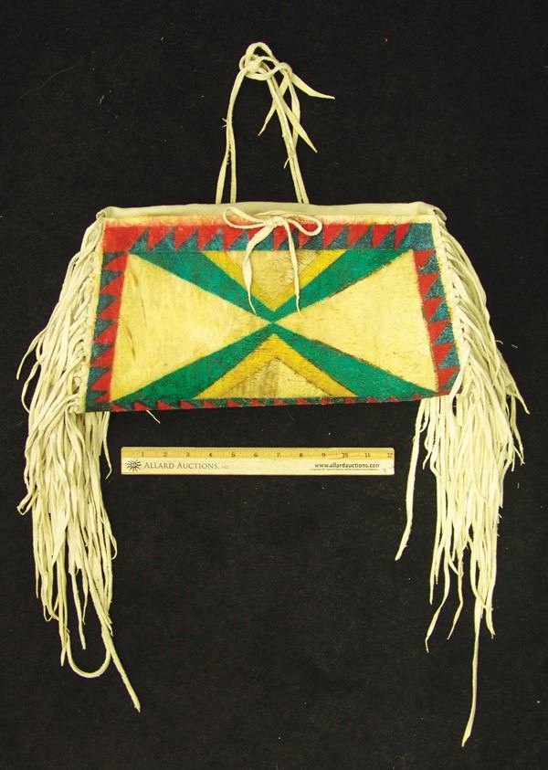 Traditional, shaped rawhide dispatch case with extra long side fringe, and mineral painted geometric designs on the front. Good condition.Mid/Late 1900s9" x 16"