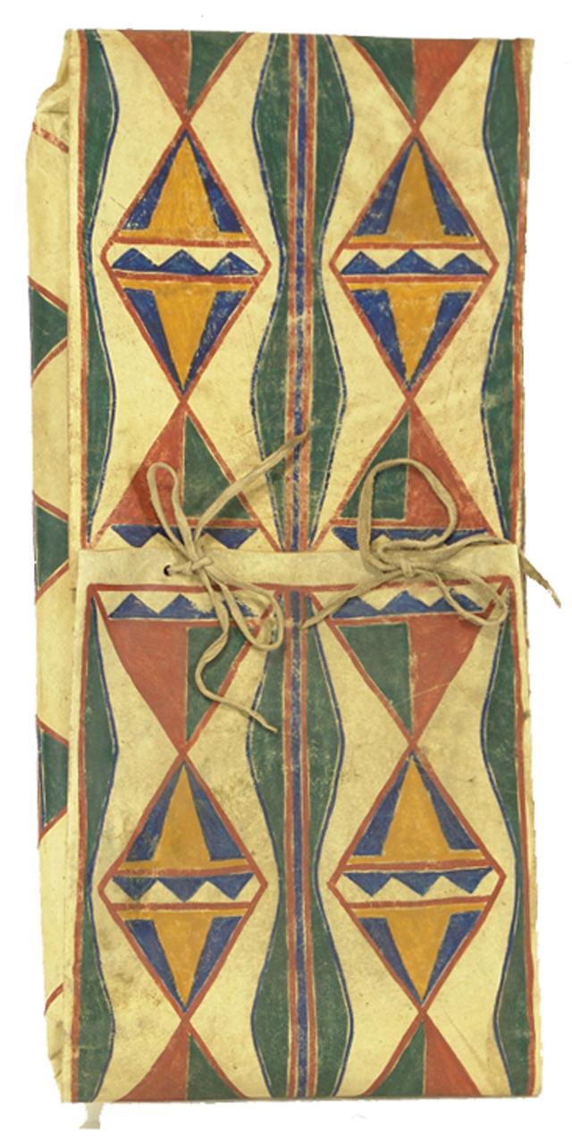 Mid/Late 1900s, Beautiful traditional-style folded rawhide container, the geometric designs done with pigment paints. 30" x 31"