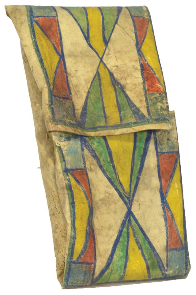 Late 1800s, Traditional design folded hard rawhide "suitcase"/container with earth pigment painted design. 28" x 15"