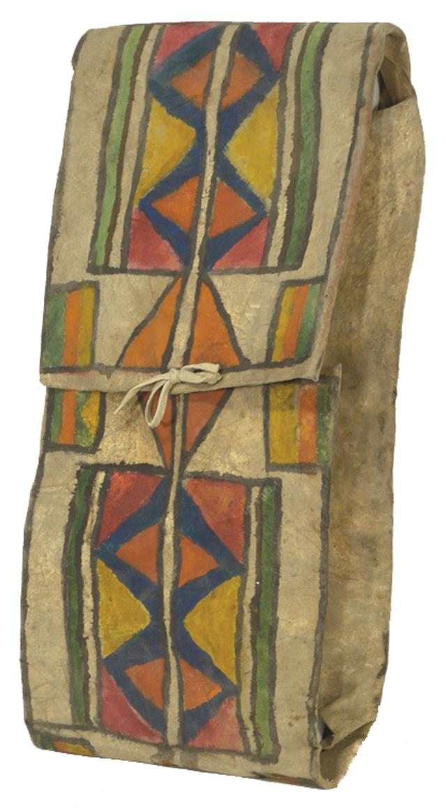 Late 1800s, Traditional design folded hard rawhide "suitcase"/container with earth pigment painted design. 27" x 13"