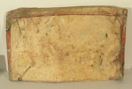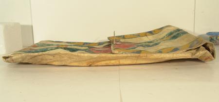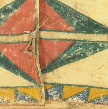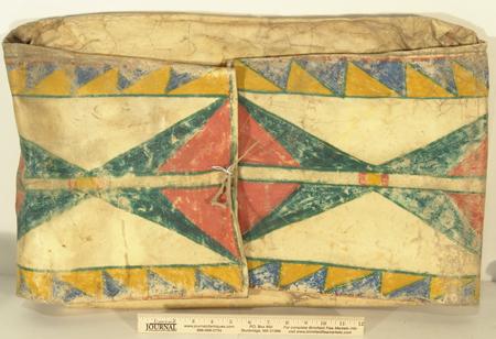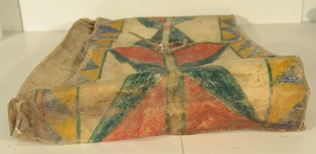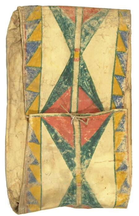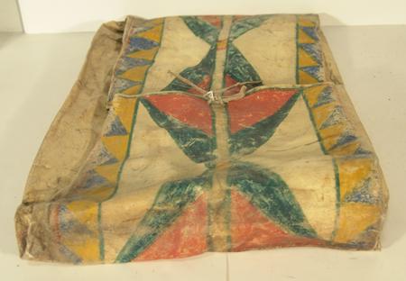 Classic folded rawhide "suitcase" with traditional mineral painted geometrics. Purchased from Orley in 1975 for $120; appraisal value $1,800. Condition: good, used. 27" x 16"