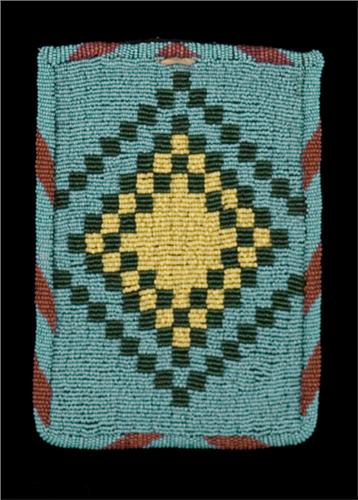 Plateau Pouch. 7" x 5". Yellow and green beads on blue beaded background. 19th century. Excellent condition. ($600-800)
