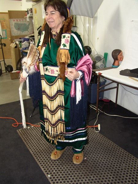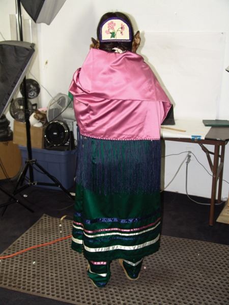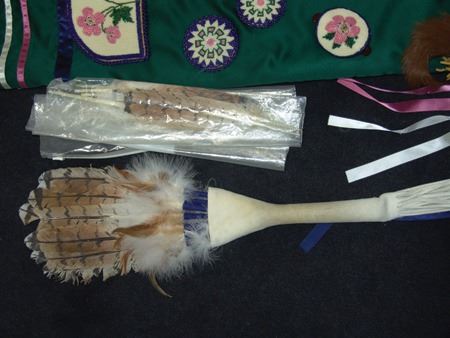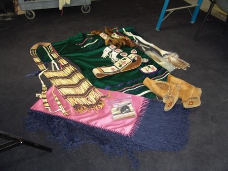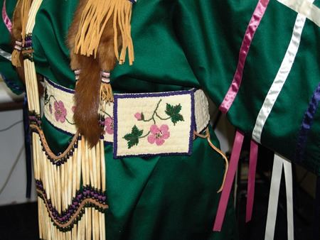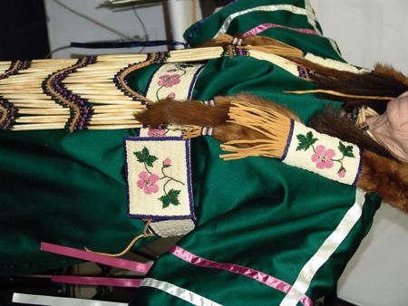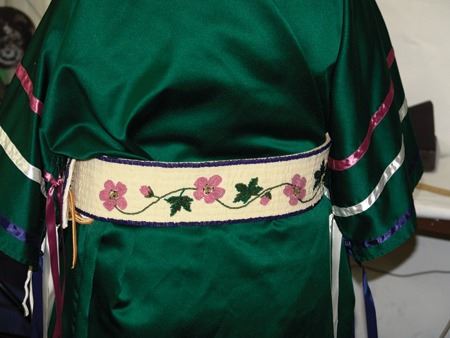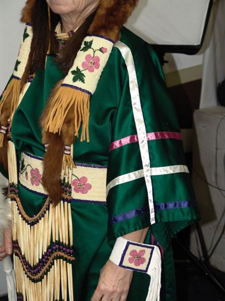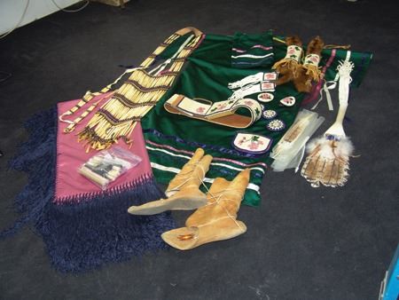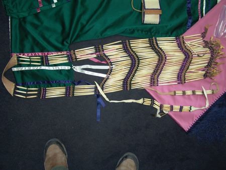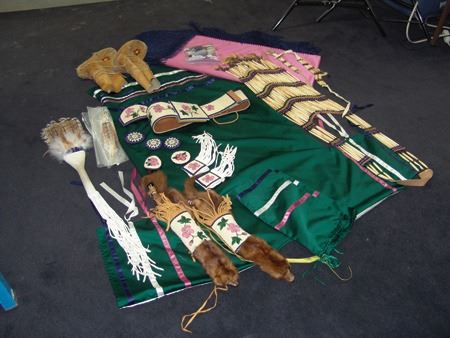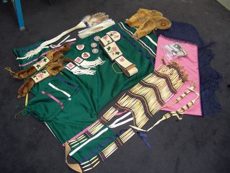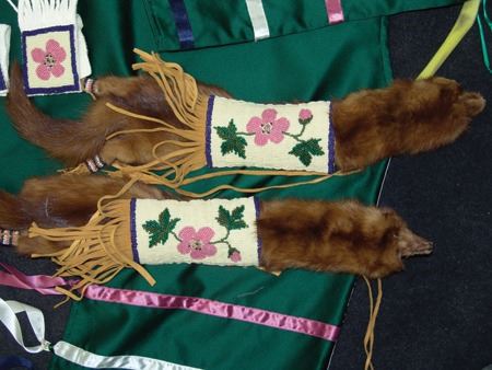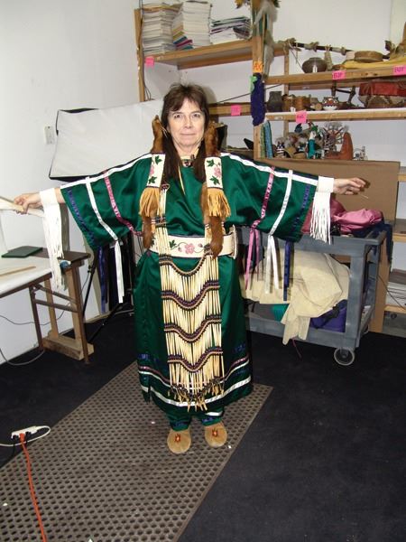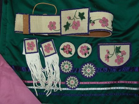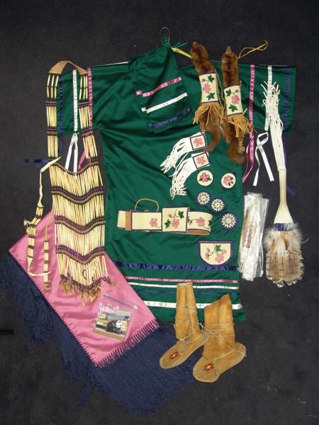 Ca. 1970s-1980s, Complete set of hand crafted items including a green satin dress with matching leggings, both with ribbon trim, plus a number of flat beaded pieces including a wide belt with shield buckle, weasel hair wraps, wrist cuffs, a large hair holder, several round barrettes and pins, plus a matching long breastplate necklace, choker, feather fan, and moccasins. The moccasins and fan have not been finished with their new matching beaded designs, but the original maker's beading supplies are also include so it can be completed (which we can arrange for you). Very good condition. Women's large