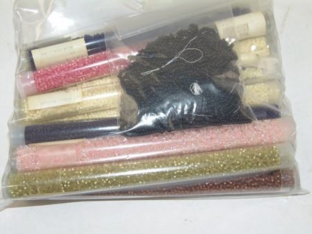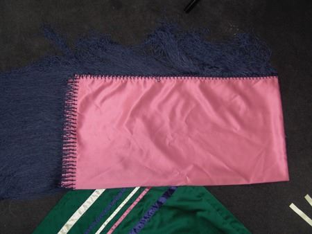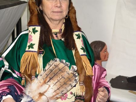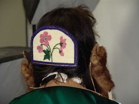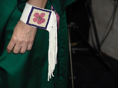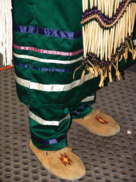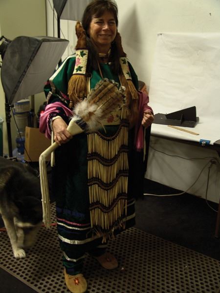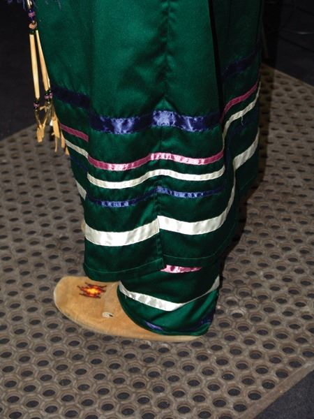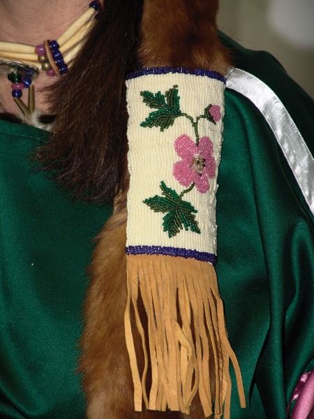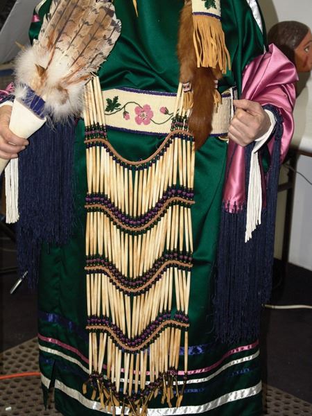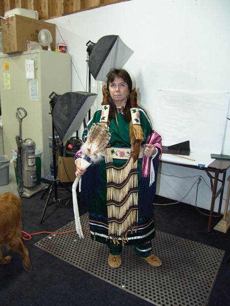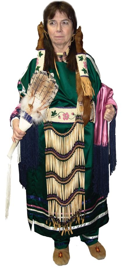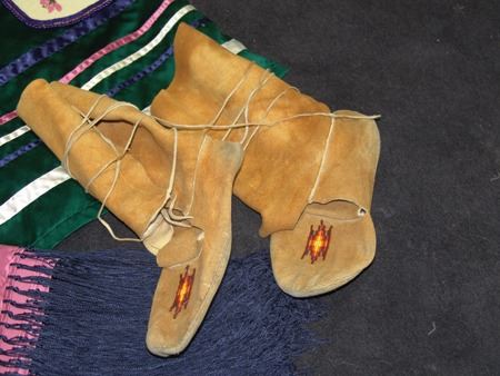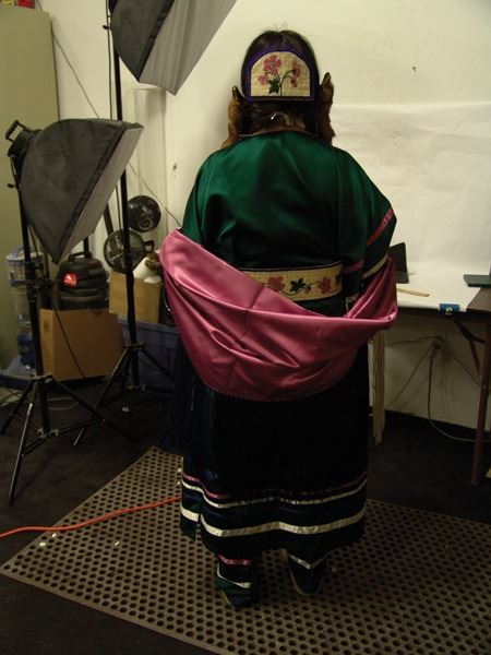 Ca. 1970s-1980s, Complete set of hand crafted items including a green satin dress with matching leggings, both with ribbon trim, plus a number of flat beaded pieces including a wide belt with shield buckle, weasel hair wraps, wrist cuffs, a large hair holder, several round barrettes and pins, plus a matching long breastplate necklace, choker, feather fan, and moccasins. The moccasins and fan have not been finished with their new matching beaded designs, but the original maker's beading supplies are also include so it can be completed (which we can arrange for you). Very good condition. Women's large