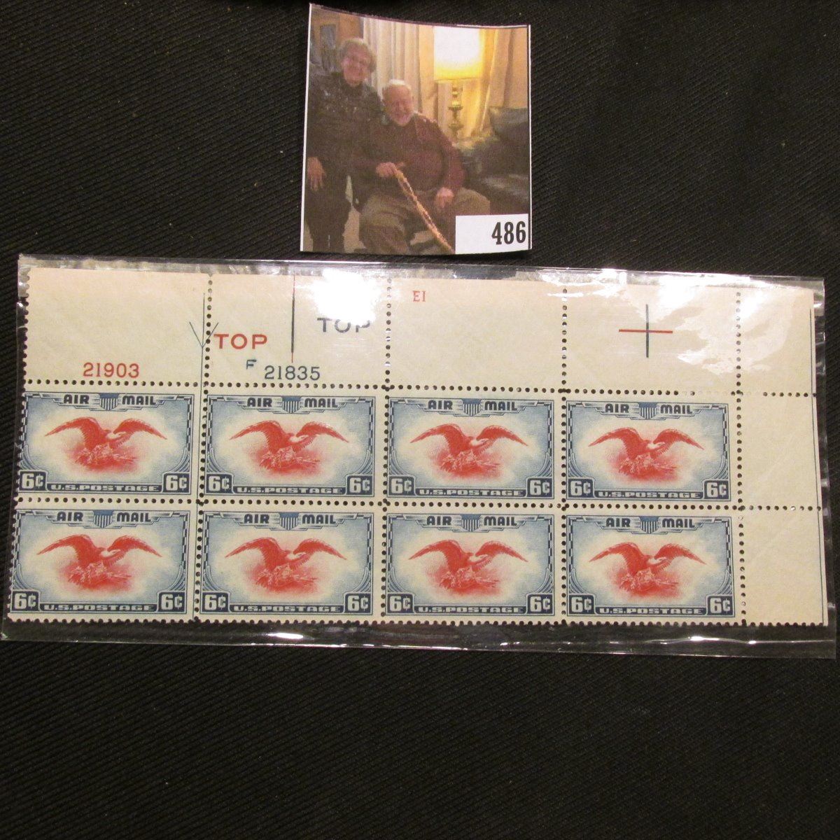 Plateblock of 8 Scott C23 Eagle and Shield 6 Cent Airmail Stamps Issued 1938, Mint condition.