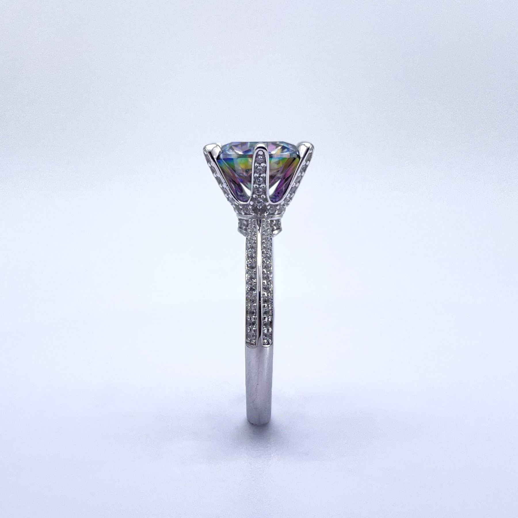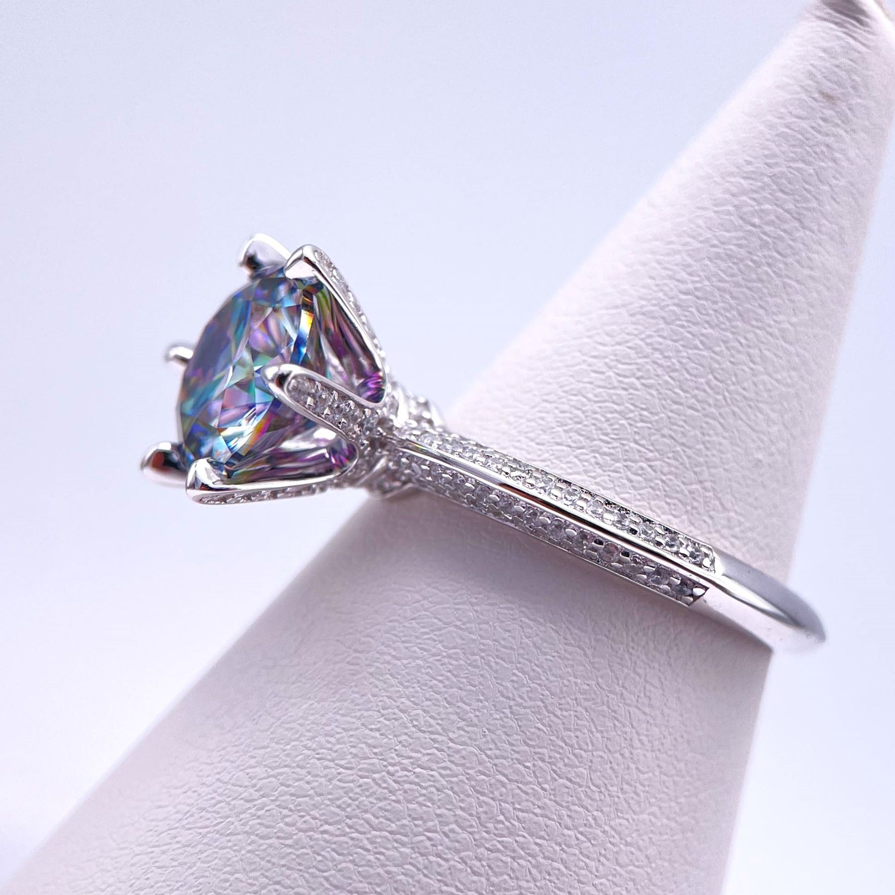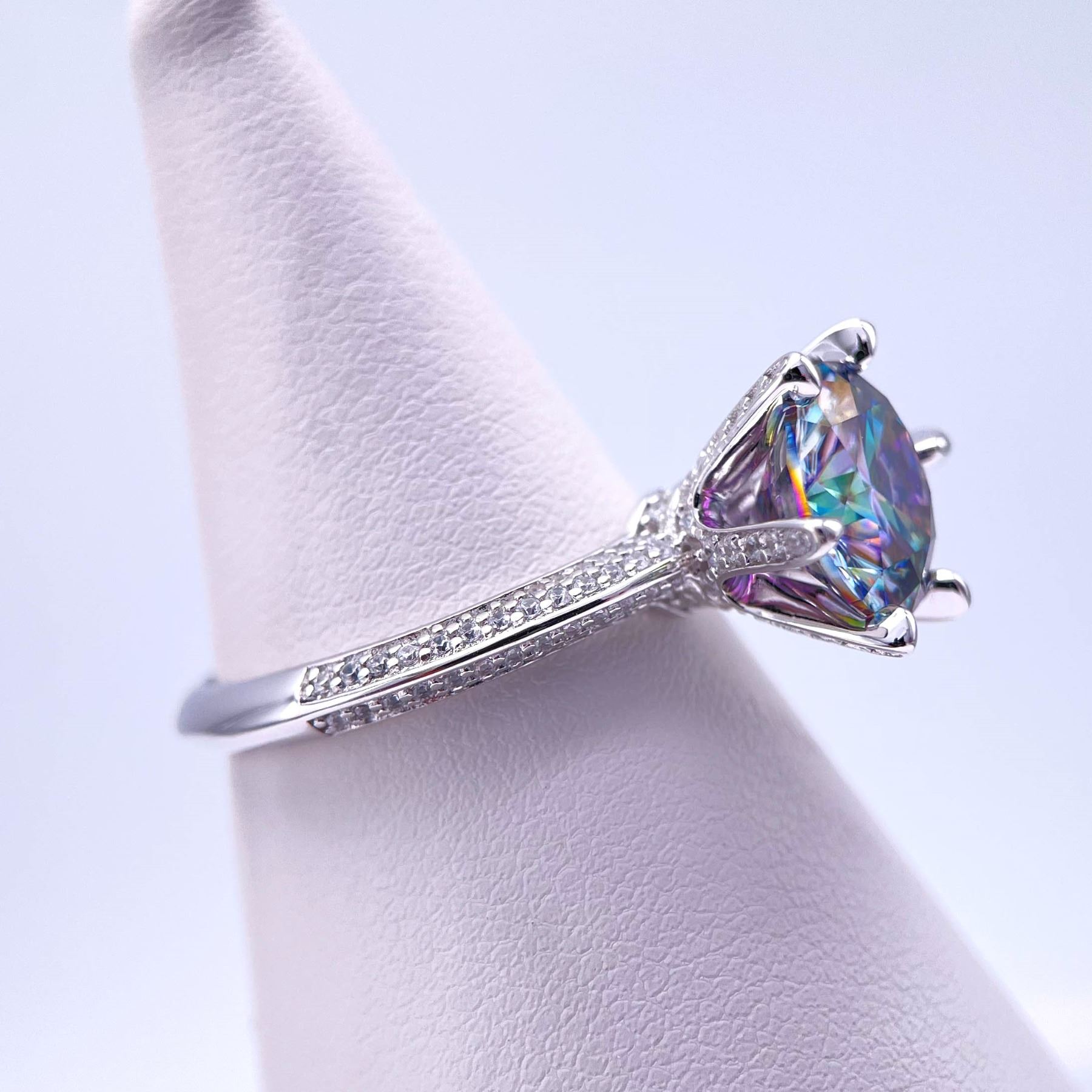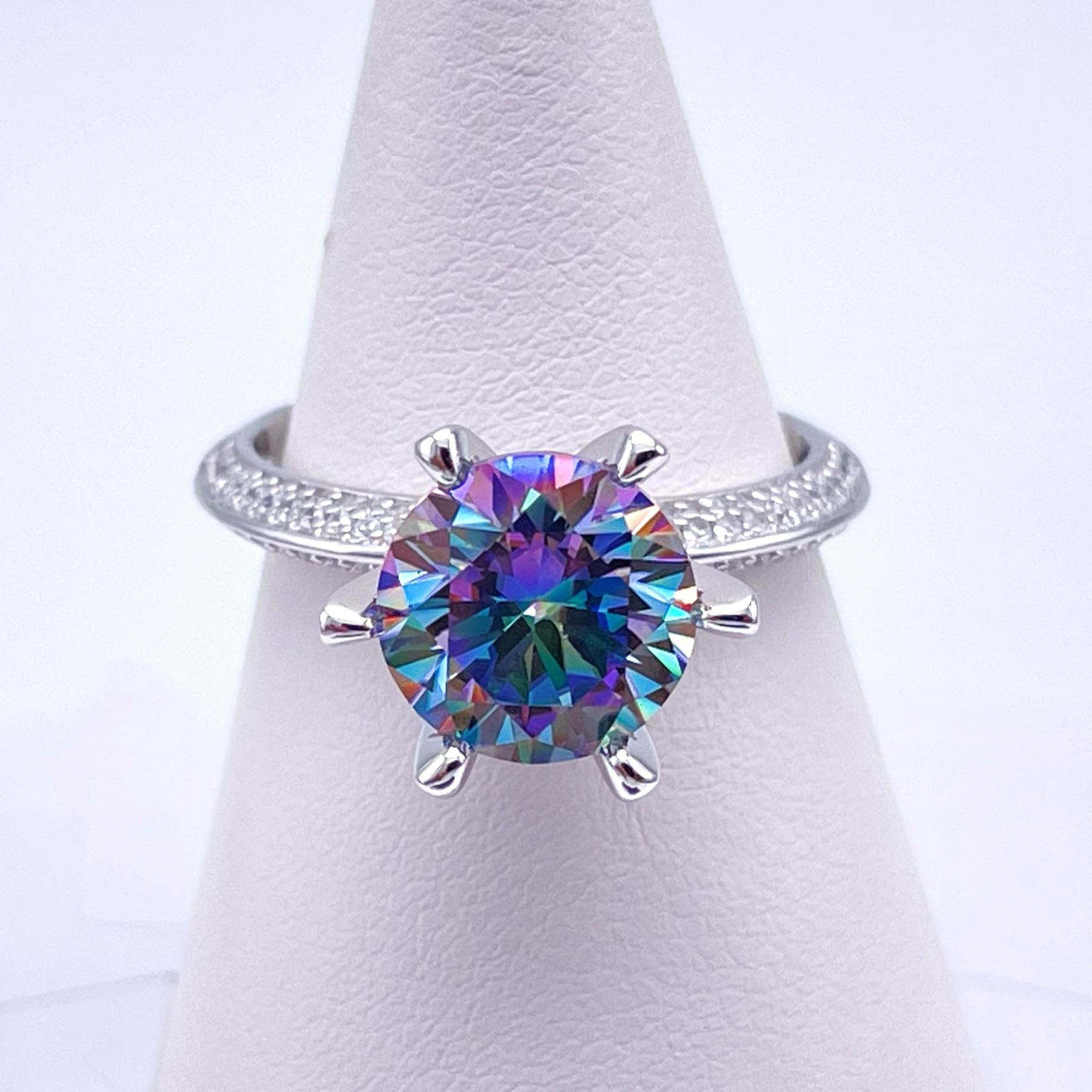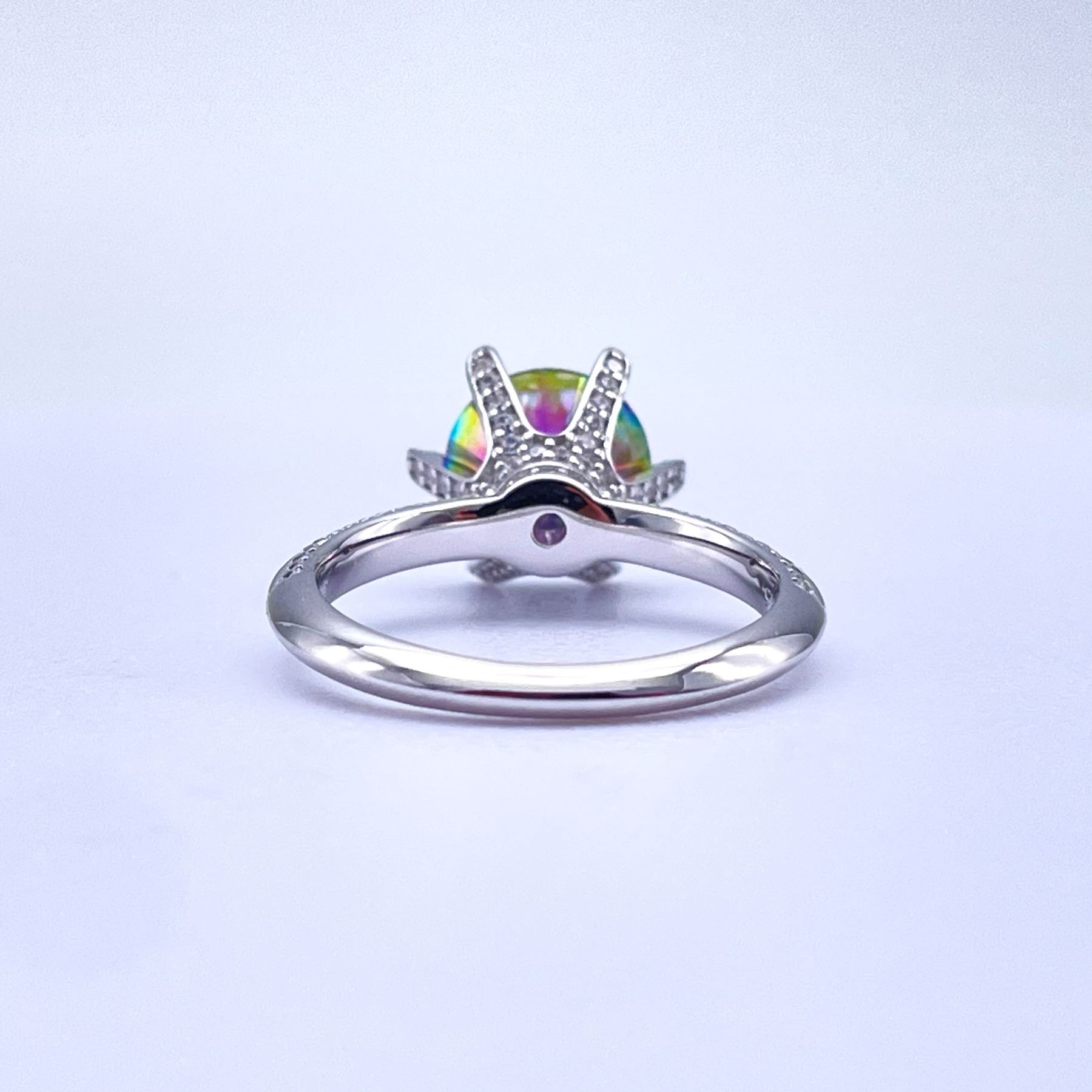 This Alexandrite 3 Ct Lab Created Color Change Stone is a VVs1 Eye-Clean Fine Round Cut Measuring 9mm. The color spectrum ranges from beautiful greens, blues and pinks depending on the light and the angle viewed. This spectacular High End Centerstone is mounted in Tri-Layered 14 Kt White Gold Plate over Solid .925 Sterling Silver, the 14 Kt White Gold overlay gives the ring its high polish and shine. The Ring is a size 7. The total weight of this ring is 4 grams. This ring is very classy, elegant and its timeless beauty is just one the reasons it is such a popular and sought-after Gemstone Ring. Do not miss this beauty!!!