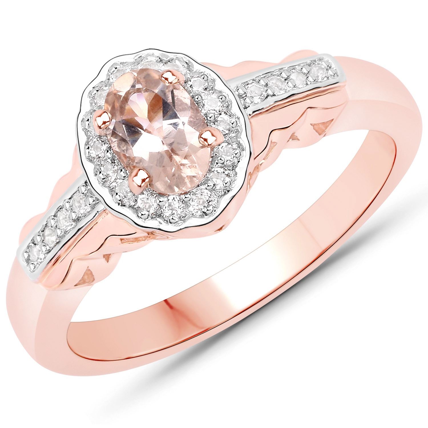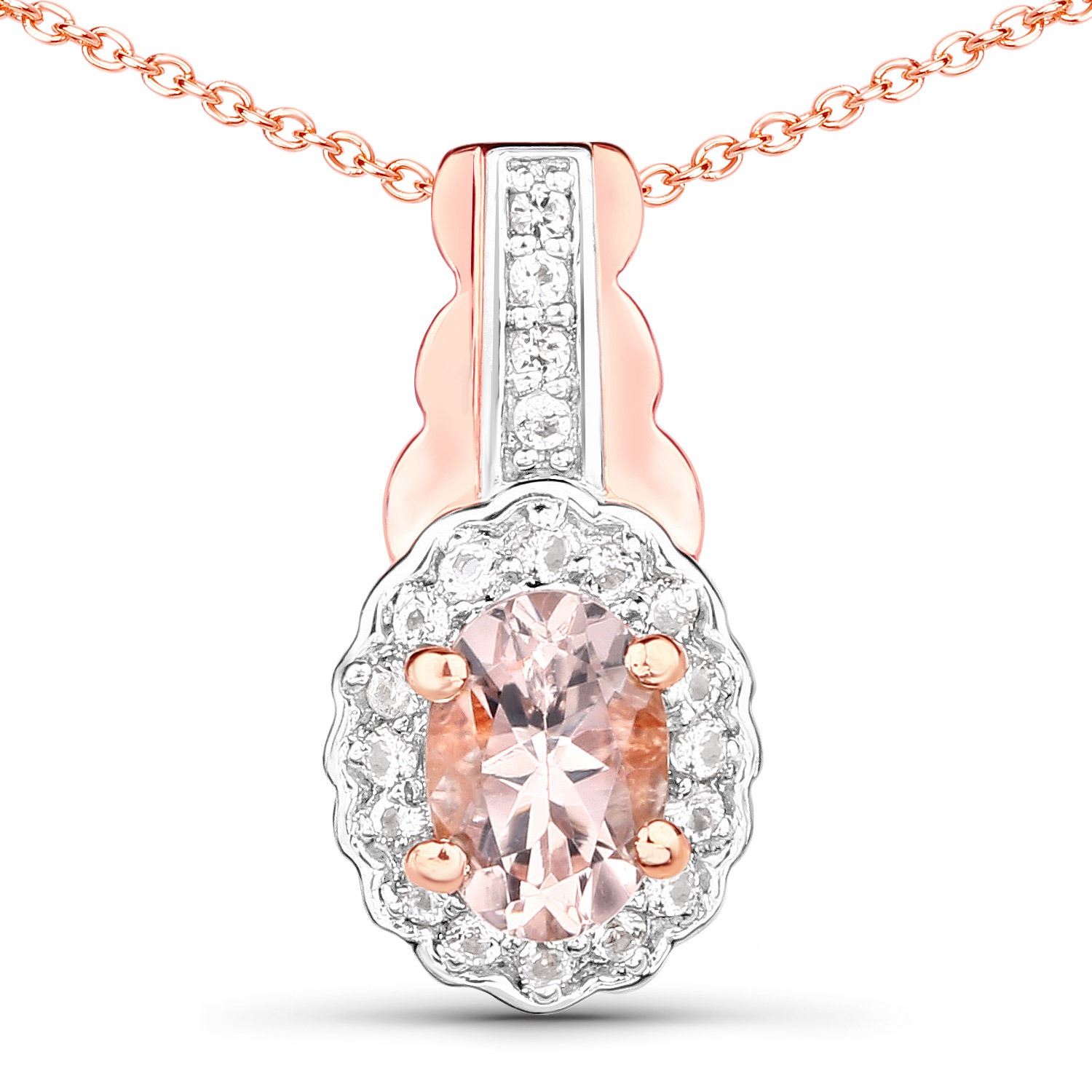 This elegant women's jewelry set features a total of 80 stones crafted in .925 sterling silver with a 14K rose gold plated finish. The set showcases four natural oval-shaped morganite gemstones, each measuring 6x4mm and totaling 1.60 carats, set in secure prong settings. Accenting the morganite are 76 round natural white topaz stones, each 1.00mm in size, contributing an additional 0.38 carats for a combined gemstone weight of 1.98 carats. Ring size 7. Cable chain secured with spring ring clasps. With a gross weight of 8.78 grams and a soft pink hue as the primary stone color, this morganite jewelry set blends refined craftsmanship with romantic charm.